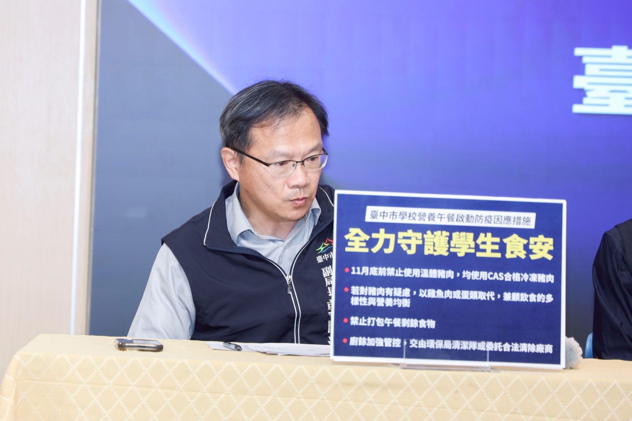 黃副市長表示,教育局將要求台中市所有校園的營養午餐禁用溫體豬肉,維持使用合格廠商、提供有CAS標章的冷凍或冷藏豬肉,且禁止打包外帶;農業局則在3日之內,全面清查168家養豬場和大安肉品市場,確保目前的豬隻與肉品安全無虞;食安處將加強稽查豬肉來源與肉品標示;而經發局監控市場肉品供應是否充足,關注肉品價格和蛋品是否受到影響。