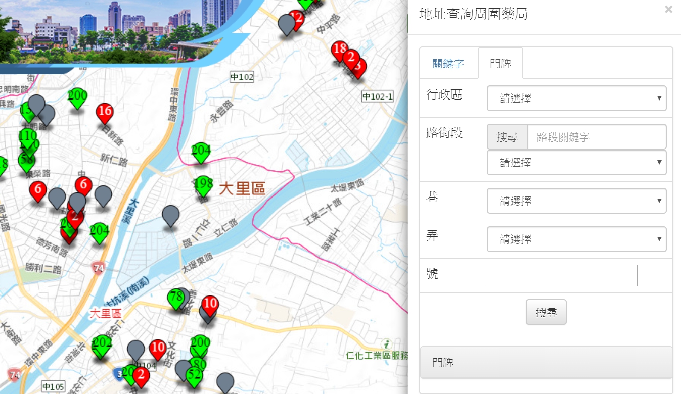 研考會主委吳皇昇表示,在資訊中心的努力下,「台中即時口罩地圖」除了可以在地圖上清楚看到本市健保藥局位置外,也可透過輸入地址查詢居家所在地附近的特約藥局,圖標立即顯示藥局名稱、電話、地址,以及該藥局的成人、兒童口罩的剩餘數量,吳主委指出,為了給民眾更直觀的貼心服務,這個平台還利用不同顏色來代表口罩存量的多寡,操作十分便民。