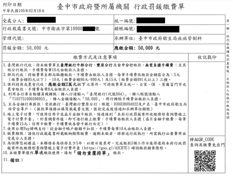 台中市政府衛生局表示,今日開罰兩例,均經警察局及民政局通報蒐證,確定其行為已違反《傳染病防治法》第58條第3項規定,依法開罰,展現公權力,呼籲進行居家隔離與檢疫的民眾,務必確實配合,勿擅離指定住所,以免觸法。