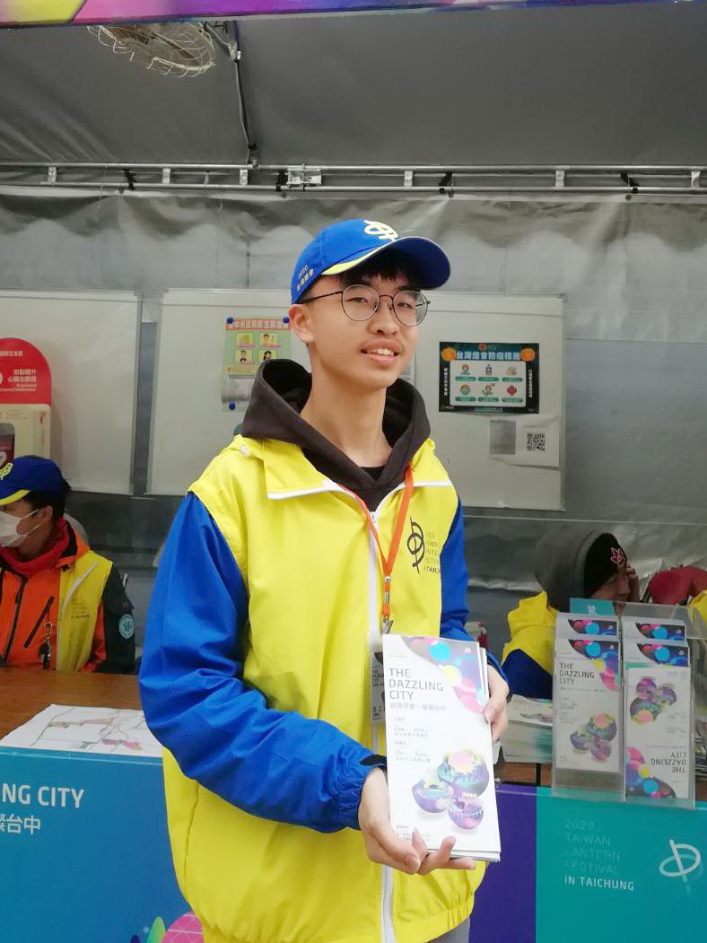 歷經高三生「學測」之後,他馬上披上專屬燈會志工的黃藍色外套,再次投入台灣燈會,擔任參與客服組志工,原本只有下課後服勤第三班的他,也因武漢肺炎延後開學之際,天天提早前往燈區協助行政工作、幫忙服務站點間支援配送,當起志工中心的救援小幫手。