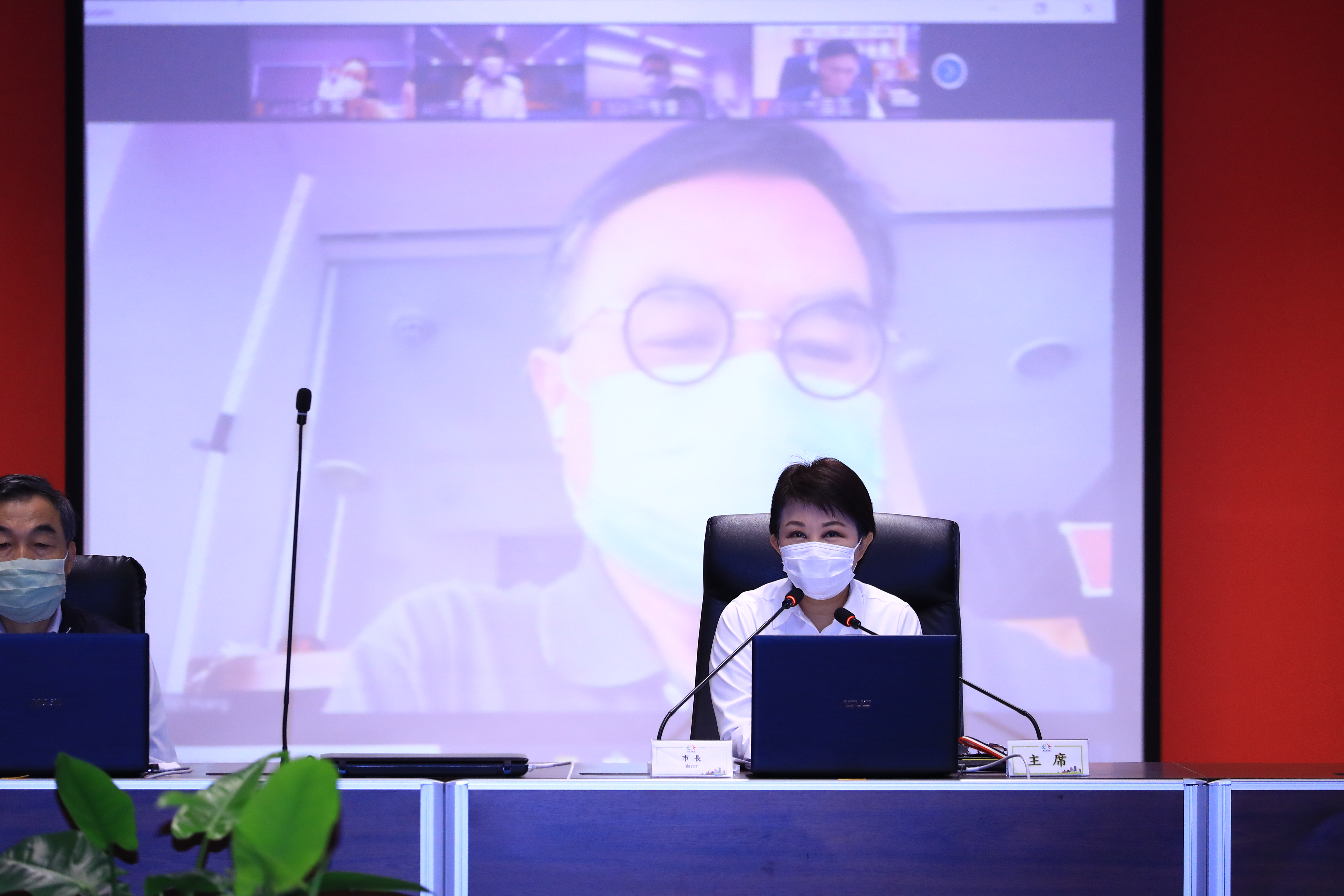 台中市政府防疫再升級!今(24)日召開市政會議,首次以「視訊」與各區長連線開會,居家自主健康管理的都發局長黃文彬也參與視訊連線,感謝各界對他的關心,會議中並採取多項防疫作為,包括梅花座保持間隔、全員全程戴口罩、限制會議人數等。市長盧秀燕表示,市府會做最好示範,一起守護城市安全。