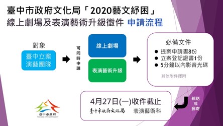 因新冠肺炎疫情影響藝文活動,台中市政府文化局擬定「藝文紓困3+2」,包括場地費用全額退還、放寬受補助演出辦理期限、提早撥補助款,也推出「線上劇場」、「表演藝術升級計畫」徵選,民眾在家就能欣賞精彩表演,也協助藝文團隊度過難關,即日起開始徵件至4月27日,歡迎藝文團隊踴躍參與。