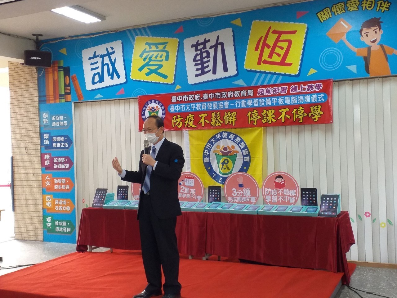 因應新冠肺炎,台中市政府教育局為避免若未來學校大規模停課影響學生學習,整合線上學習課程供停課學生自主學習、盤點各校平板數量並動支賸餘基金購置,許多家長協會及團體也捐贈平板,共同維護學生受教權益,台中市太平教育發展協會熱心響應,捐資購置60台平板供太平區學生備用。
