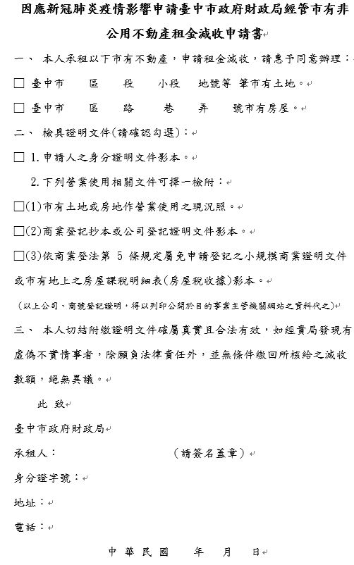 因應新冠肺炎疫情影響申請臺中市政府財政局經管市有非公用不動產租金減收申請書