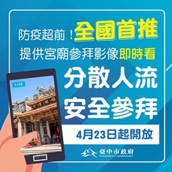 台中市政府首創「宮廟即時看」視訊服務,彙整轄內11間香火鼎盛廟宇現場即時影像,提供香客作為是否前往參拜依據,系統今(23)日上線,民眾只要到民政局網站專區( http://taichung-civil.csii.com.tw ),即可觀看廟宇即時影像,期盼有效分流人潮,降低感染風險。