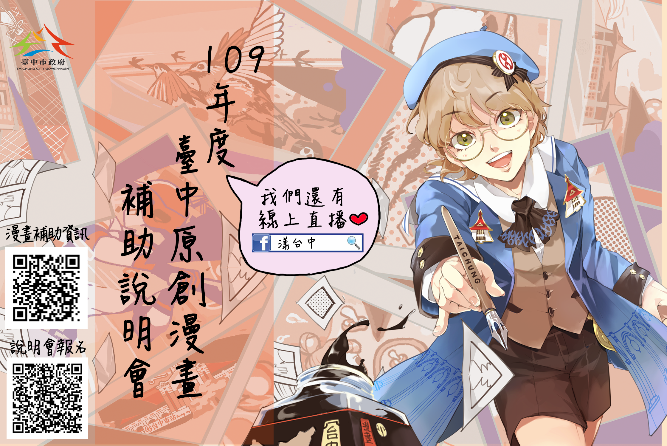 台中率先六都訂定「台中市原創漫畫創作補助辦法」,為漫畫產業編列100萬元輔導金。市府新聞局表示,為讓創作者更了解補助申請方式,昨(30)日舉辦「109年度台中原創漫畫補助說明會」,並同步於臉書「漾台中」直播,徵件時間到61日截止,預計8月底前公告補助結果,歡迎大家踴躍投件。