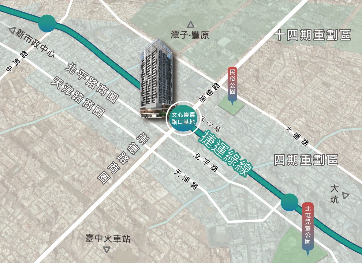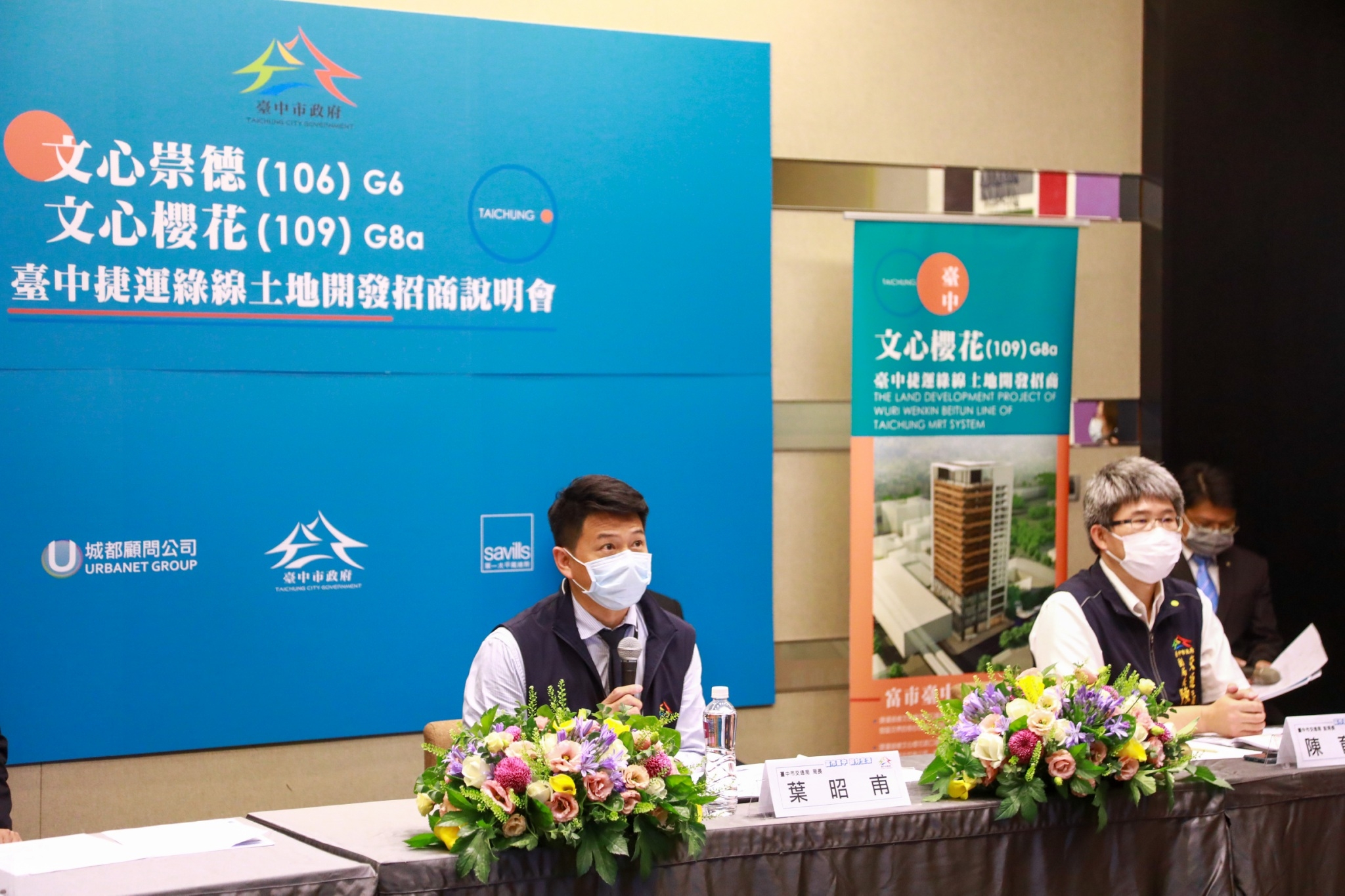 葉局長說明,文心崇德路口基地面積700坪,文心櫻花路口基地面積500坪,兩基地建蔽率及容積率均為70%及500%,預估總銷可達27億元及17億元,容許使用項目比照商業區,市府不預設立場,由投資人依市場機制充分發揮,歡迎慧眼獨具的投資人共同參與,打造台中捷運綠線璀璨雙星。