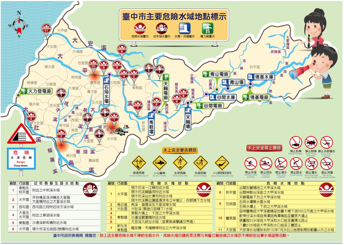 觀旅局提醒,台中市公告11處危險水域地點,屬於水流湍急、水域深淺不一、水下岩石多、小迴流區、漩渦、水面平靜而水下為深潭、有暗流及低溫等,易發生民眾靠近戲水失去戒心而造成溺水意外事故,有鑑於此11處危險水域在過去曾多次發生溺水意外事故,呼籲民眾勿拿自己的生命開玩笑,切勿前往從事任何水域活動,危險水域查詢網址(http://anti-drowing.tc.edu.tw/12a.html )。