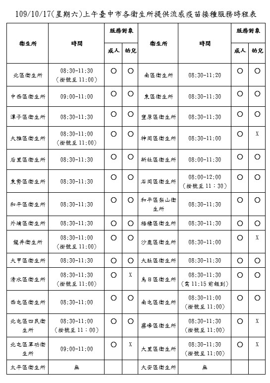 衛生局表示,依據衛福部疾管署監測資料,65歲以上長者為罹患流感併發症的高風險族群,流感併發症死亡率高居所有年齡層之冠。重陽節將到來,市府於明日推出重陽敬老市民日,凡台中市民年滿65歲以上,持身分證及健保卡前往台中市27區衛生所,可優先接種流感疫苗;大安區、太平區請至「社區設站」施打,當日部分衛生所也有提供幼兒流感疫苗接種服務。