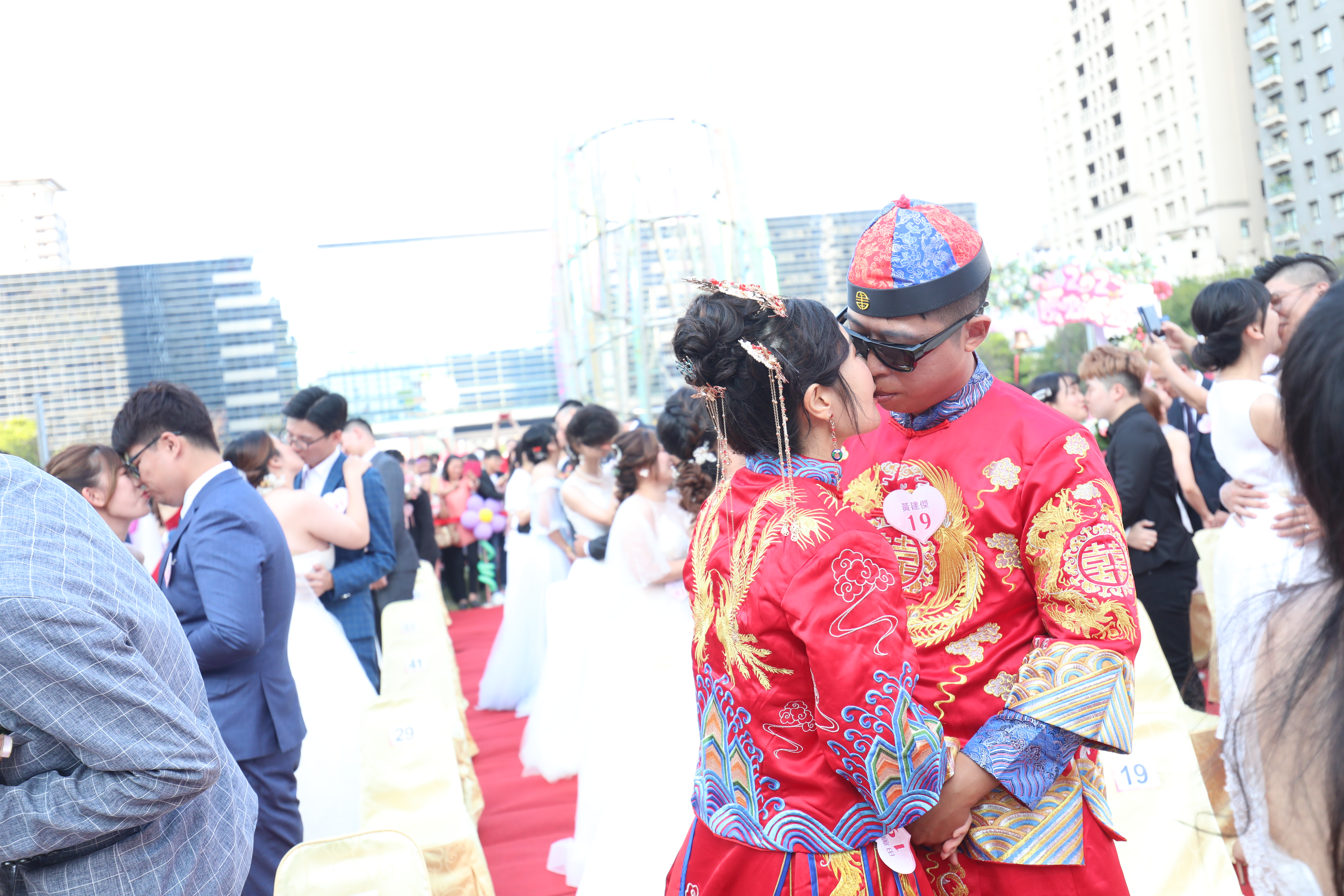 民政局說明,今日聯合婚禮99對新人之中不乏相識淵源特殊的佳偶,新人黃建傑與田蕙嘉、張維哲和謝子涵都因市府舉行的單身聯誼而相戀,今日又在市府見證之下完成終身大事;新人劉俊宏為台中市後備指揮部中士,與伴侶廖昱恩都是軍職身分,兩人今天以軍服取代婚紗西裝,在人群中十分亮眼。而劉耀文、劉懷汝兄妹,因父母在29年前參與集團結婚的經驗,分別與另一半報名參加,覺得可以在地方首長的證婚及中眾人祝福下完成終身大事極具意義。