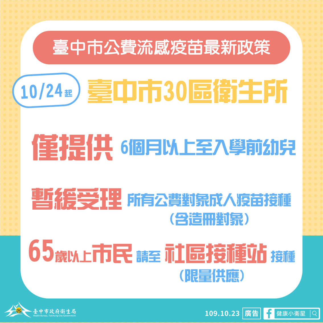 衛生局表示,截至今日上午8時止,台中市已接種超過50萬劑,使用率達採購量的67%,經評估,6個月至學齡前幼兒接種率僅23.1%,明顯偏低(目標55%),市府滾動修訂接種政策,明日起中市30家衛生所及327家合約院所僅受理6個月至入學前幼兒流感疫苗接種。