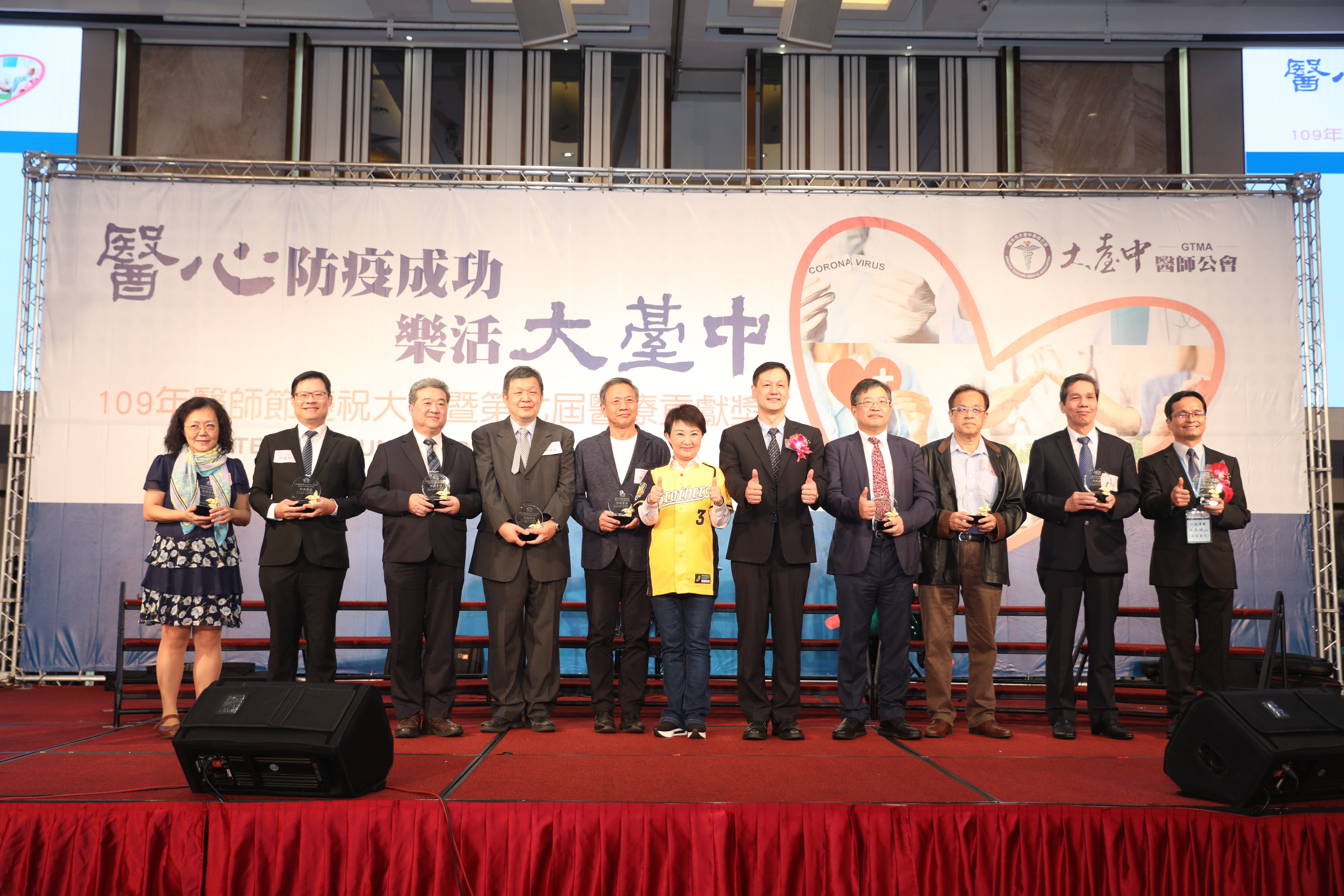 11月12日是醫師節,台中市大台中醫師公會今(1)日於葳格國際會議中心,提前舉辦慶祝大會及頒獎典禮,感謝醫師辛勞並頒發醫療貢獻獎。市長盧秀燕致詞時指著自己的衣服說,現在正值職棒總冠軍賽事,她能穿上中信兄弟球衣加油、球迷朋友可以入場觀賽,都要感謝站在第一線醫界夥伴的犧牲奉獻與用心付出,守護市民健康,讓國人面對全球疫情仍能正常生活,「辛苦了,謝謝您!」