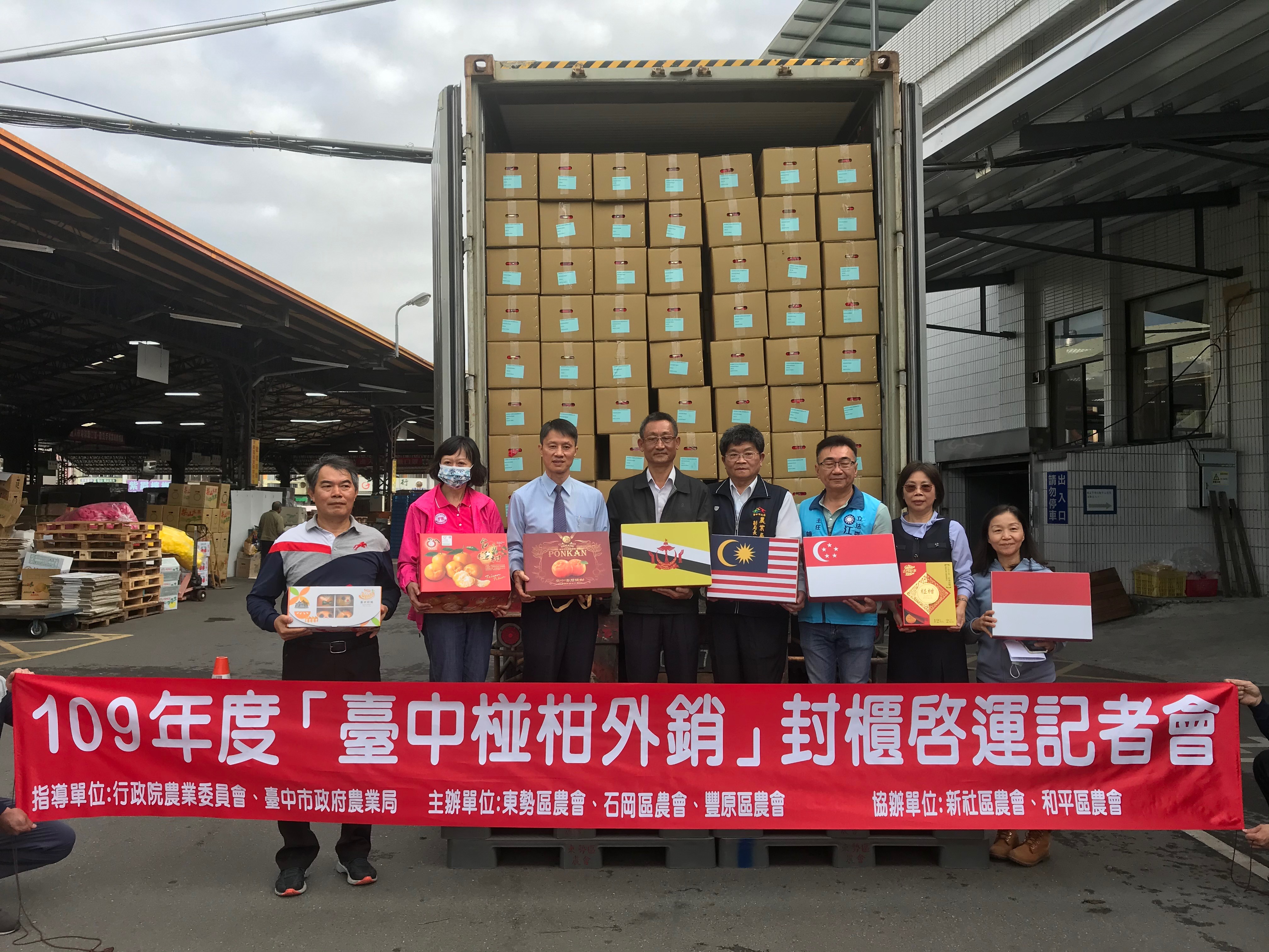 農業局表示,市府多年來將農產品國外行銷列為重點目標,期許透過外銷穩定國內農產品市場價格。今年椪柑在疫情中仍創下外銷佳績,今(29)日東勢區農會與石岡區、豐原區農會共同舉行「台中椪柑外銷封櫃啟運記者會」,由農業局副局長蔡勇勝出席,將一箱箱金黃飽滿的椪柑禮盒裝入貨櫃。