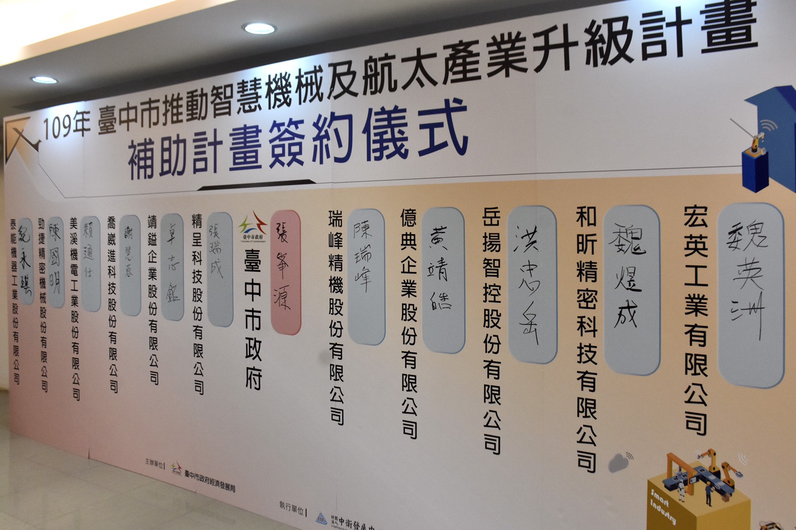 今(13)日市府舉行「機械及航太研發補助」簽約儀式暨管考說明會,於活動場地展出歷年廠商執行成果,促進各廠商經驗交流。經發局長張峯源表示,109年新冠肺炎疫情衝擊全球,為重振產業活力及強化廠商競爭力,市府持續推動機械產業研發升級,辦理第4年「台中市推動智慧機械及航太產業升級計畫」,激勵廠商投入資源優化產線、研發新技術。