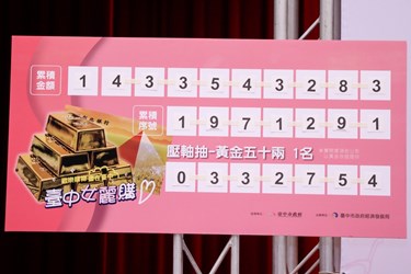 首屆「台中女麗購」以「她經濟」為主軸,推出最大獎黃金50兩及轎車、鑽戒等多項好禮號召民眾在台中消費,短短60天活動不僅締造16億元以上消費金額,更帶動在地產業、經濟效益提升。今(20)日市長盧秀燕在律師見證下,抽出壓軸最大獎黃金50兩蘇姓得主,將市價超過300萬元的黃金存摺帶回家。