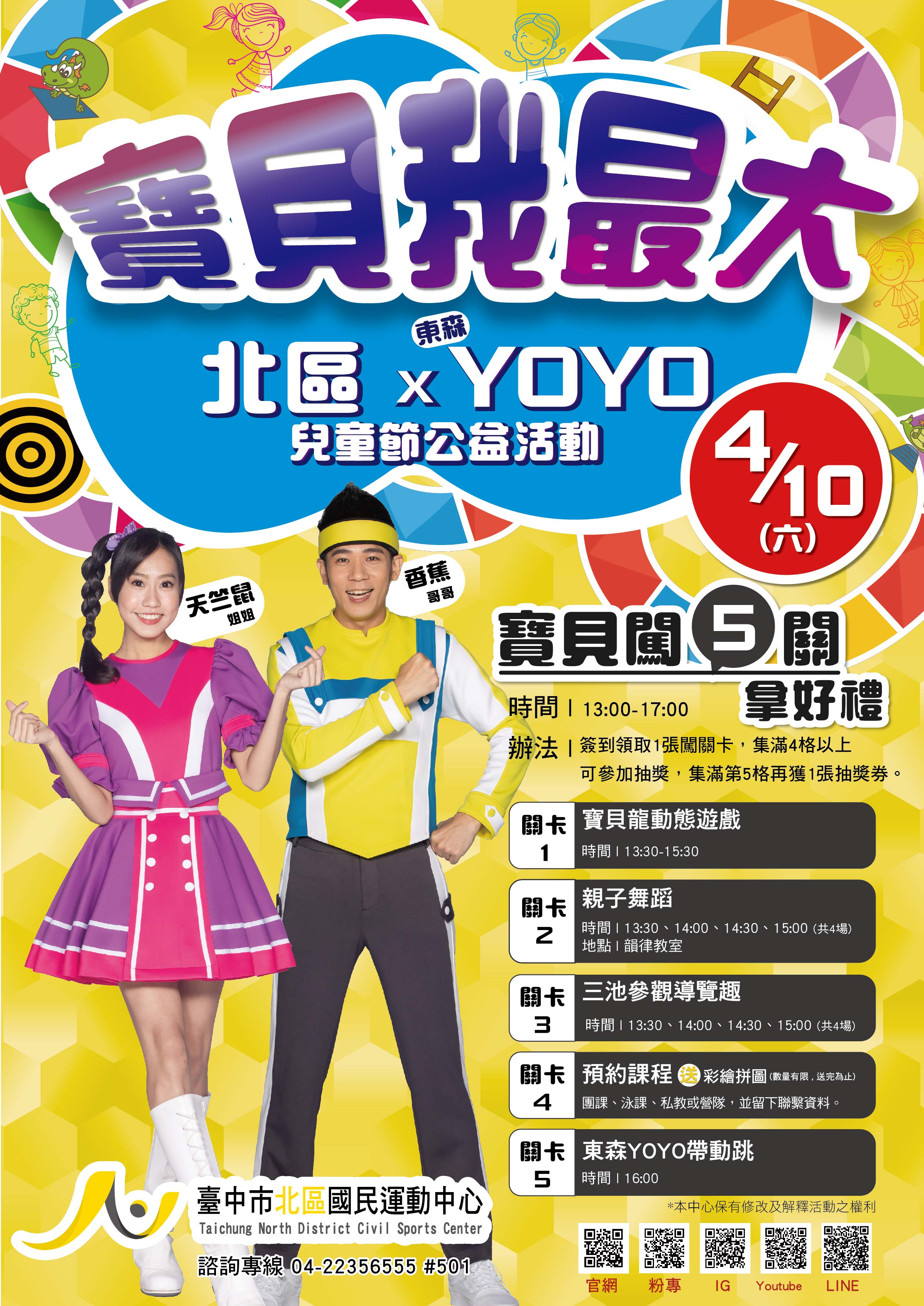 運動局說明,朝馬國民運動中心在兒童節當日上午推出「朝馬童樂會」公益活動,規劃親子闖關及兒童課程體驗,闖關集章還可參加扭蛋活動;北區國民運動中心於4月10日下午舉辦「寶貝我最大」兒童節公益活動,邀請YOYO家族成員香蕉哥哥、天竺鼠姐姐現場帶動跳,透過闖關集章參加抽獎活動。