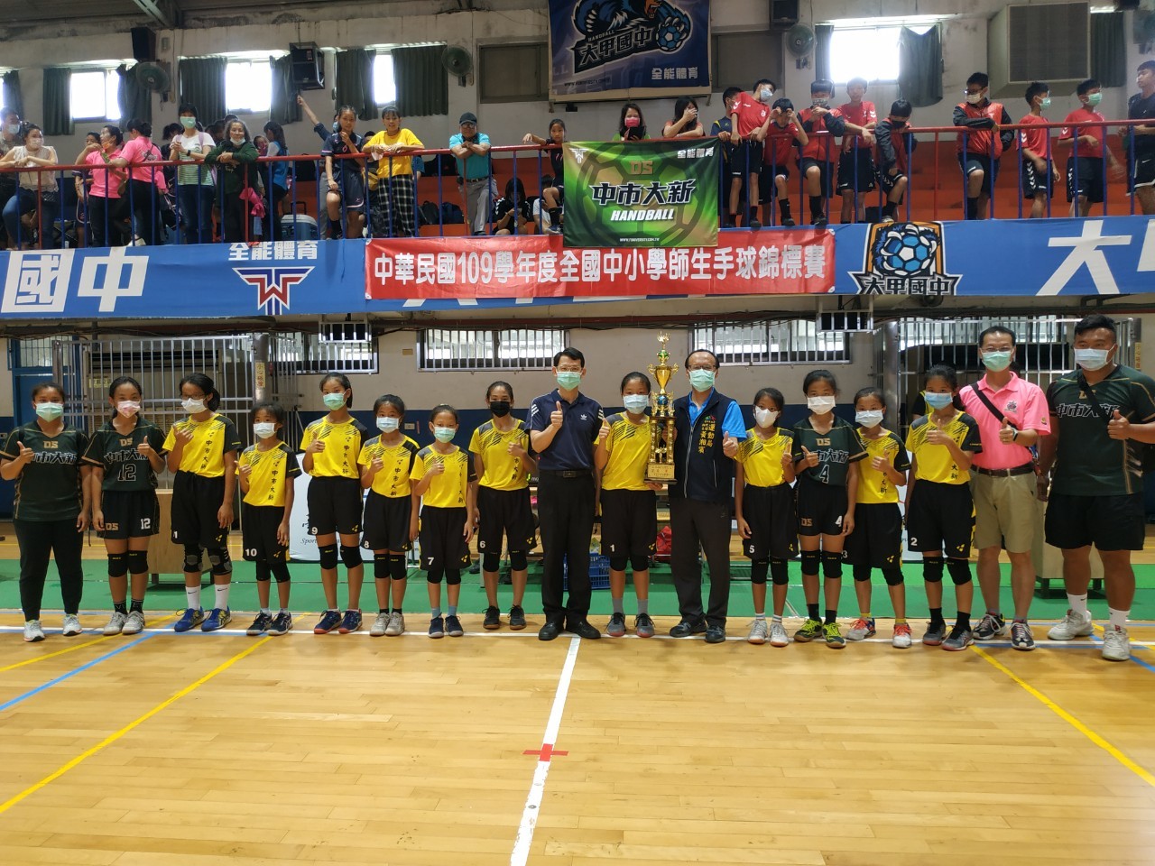 「109學年度全國中小學師生手球錦標賽」今(2)日於台中市大甲國中滿落幕,吸引全國高達116隊、近2,500人參賽。市府運動局競技運動科長黃湘賓到場為國小迷你女子組頒獎,恭喜新北市中和國小勇奪冠軍、在地大新國小榮獲亞軍,肯定基層手球選手發揮團隊精神,及教師組踴躍參與,也期勉台中市選手繼續努力,爭取今年全國運動會冠軍榮譽。