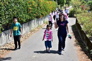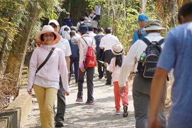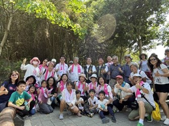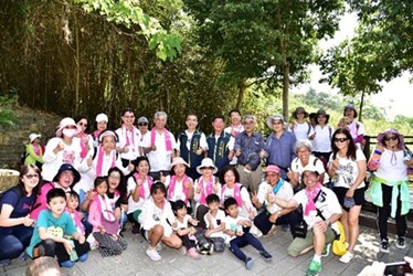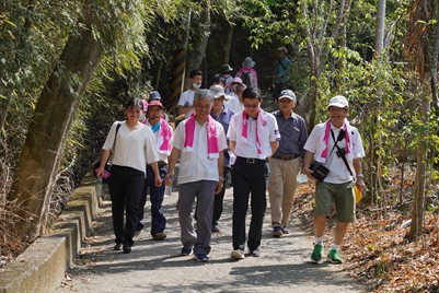 今日活動范副主委與江主委全程參與健行,沿途賞桐花並與參與的民眾話家常,途經伯公廟時,眾人一起向土地「伯公」行禮致意,感恩山神庇佑客庄。