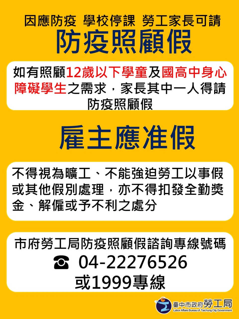針對外界關心學生停課,家長如何請假照顧,勞工局長張大春說明,勞工如有照顧12歲以下學童需求,家長其中一人得請「防疫照顧假」,累計最多可請假14天,雇主不得拒絕,也不得視為曠工、或強迫勞工以事假或其他假別處理,亦不得扣發全勤獎金、解僱等處分,市府防疫照顧假諮詢專線號碼04-22276526或1999專線。