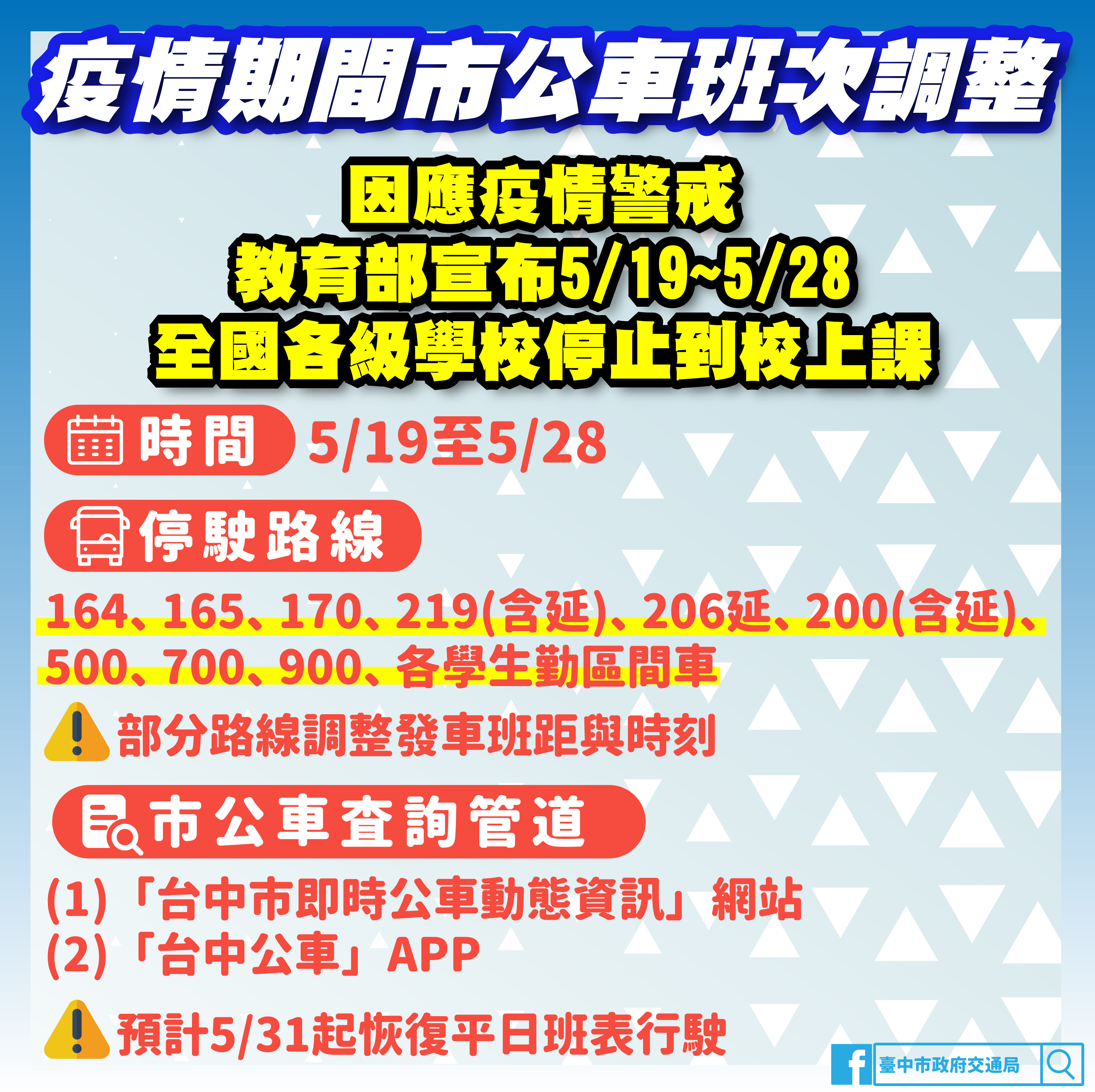 交通局長葉昭甫表示,因應疫情升溫,教育部在今(18)日中央流行疫情指揮中心記者會中宣布「全國各級學校因應疫情停課居家線上學習」,台中公車眾多路線中針對通學族群所行駛的區間車、延、繞及200、500、700及900路等公車路線原則停駛,有寒暑假班表的公車路線,於停課期間一律改為寒暑假班表發車,待宣布台中恢復到校上課日,中市公車再全面恢復服務。