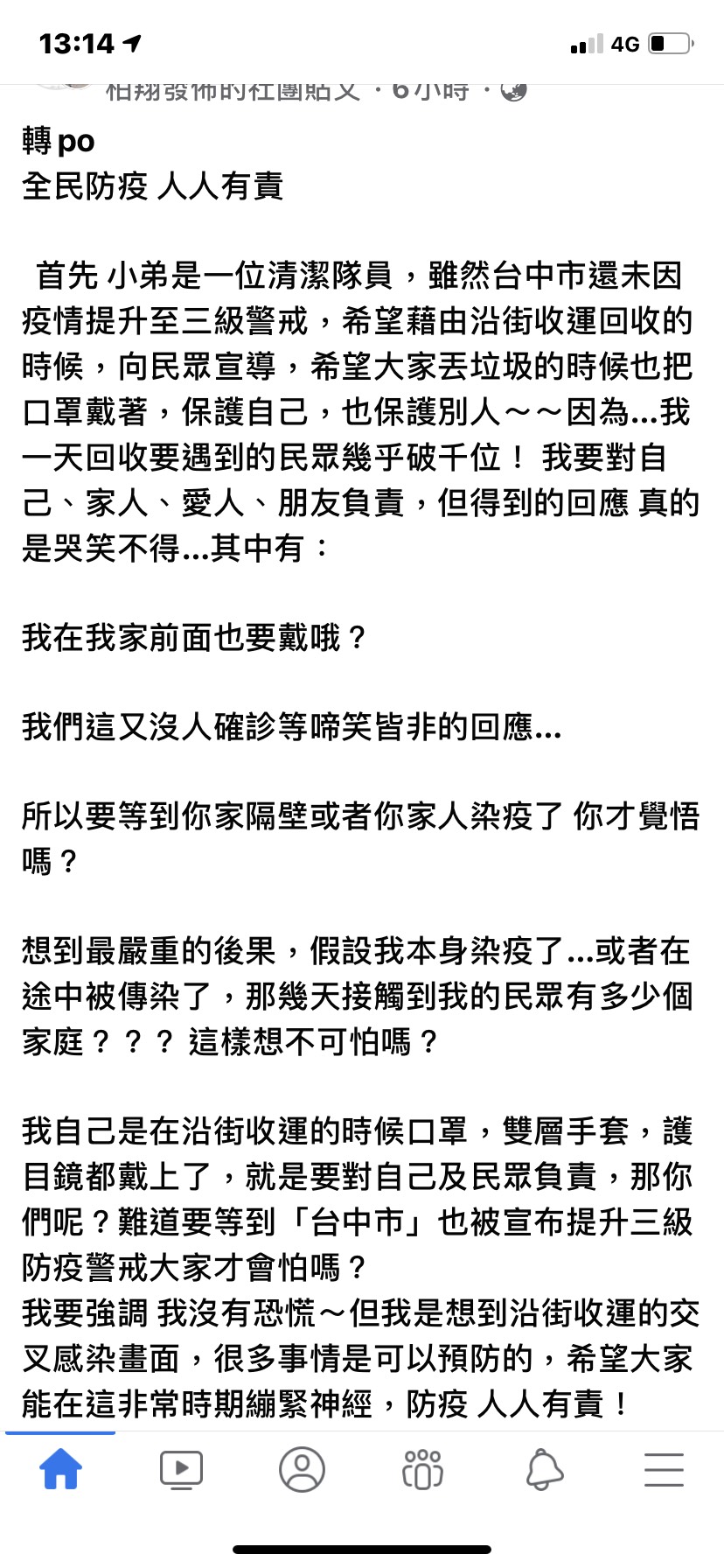 該名PO文的清潔隊員表示,自己在沿街收運的時候除了戴口罩外,連雙層手套、護目鏡都戴上,就是要對自己及民眾負責。同時,他也呼籲民眾倒垃圾要戴口罩保護自己也保護別人,更要市民對自己、家人、愛人、朋友負責。