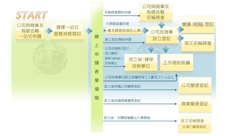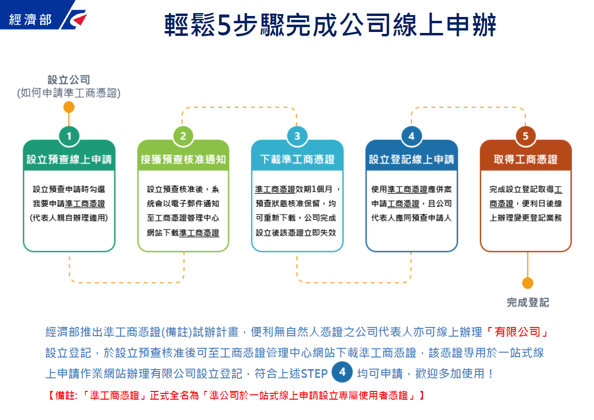 經發局強調,公司及商業一站式線上申請作業相當便利,只要申請註冊成為「我的E政府」會員並備妥讀卡機,使用自然人憑證或工商憑證,依照網站指示步驟上傳應備文件及繳費,即可線上申請公司商業設立及變更;此外,網站也有使用者練習區功能,無須登入與使用憑證及填寫表單資料,即可了解線上申請流程與作業全貌。