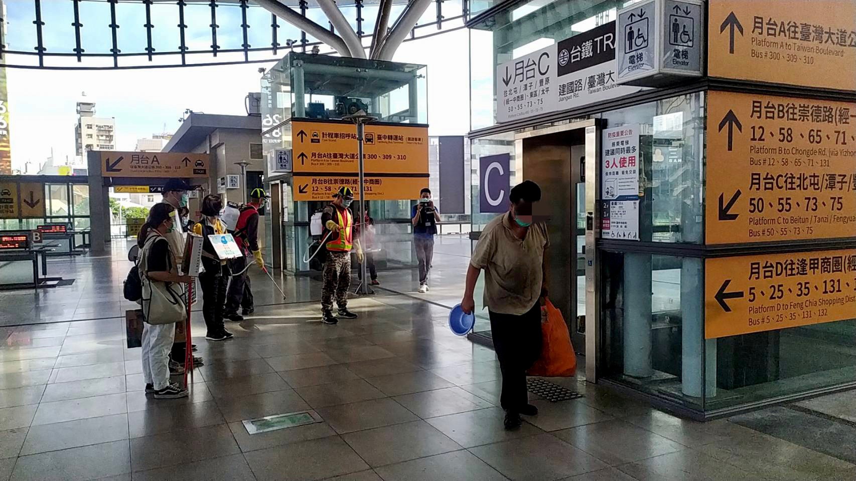 全國疫情警戒升至三級,台中市政府環保局、建設局、交通局、社會局昨(20)日聯合會勘,擴大消毒台中火車站周邊環境,火車站出入口也設置鞋底消毒水盤,降低病毒傳播風險,因車站有街友佇留,社會局請街友暫時離開,並發送生活物資防疫包,提醒街友自我保護,落實防疫。