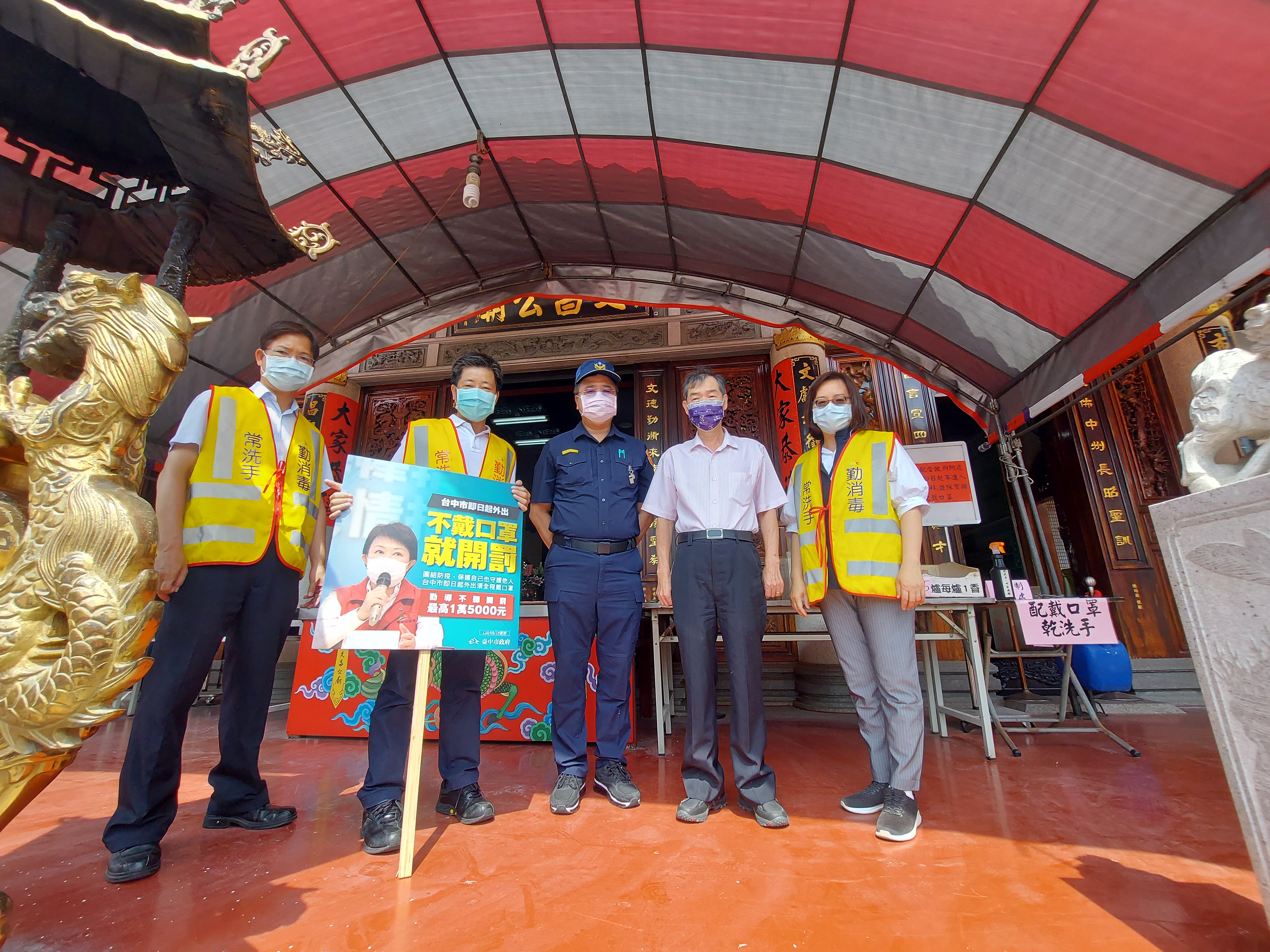 國內疫情嚴峻,中央疫情指揮中心宣布全國升至第三級警戒,民眾外出須全程佩戴口罩,經勸導不聽最重可罰15,000元。台中市政府民政局副局長周瑺玫今(21)日前往南屯區萬和宮和文昌公廟視察宗教場所防疫情形,同時加強防疫宣導,並呼籲民眾疫情期間避免參加聚會活動或前往人潮聚集、密閉空間的公共場所,若有特殊情況須外出時,也請全程佩戴口罩,落實防疫措施。