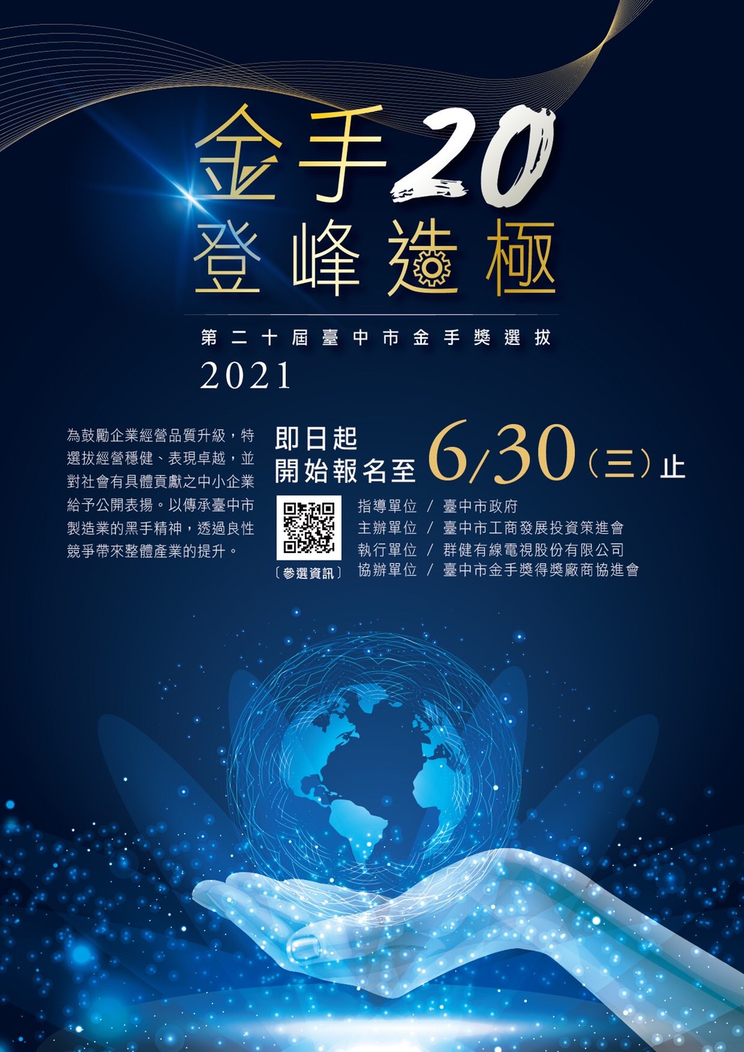 黃總幹事指出,台中市金手獎今年邁入第20屆,現正值報名期間,希望更多優質的在地企業參與角逐,獲獎企業不僅是台中的經營之神,更是市府及市民在疫情危難中最堅強的後盾。