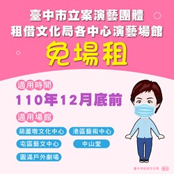 文化局表示,台中市品牌演藝團隊5月至6月取消或延期超過190場活動,影響許多演出及推廣計畫,藝文工作者生計也面臨難題,文化局升級推出「2021表演藝術相挺PLUS」四大紓困措施,首先,「場館免費」,台中巿立案演藝團體今年1月至12月,使用文化局各中心演藝空間場租免費。