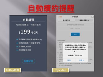 「居家耍廢救臺灣」,新冠肺炎疫情嚴峻,許多民眾居家最常以追劇作為居家躲疫情的良方。許多影音串流業者也順勢推出免費體驗活動,吸引消費者前往訂閱。台中市消保官逐一測試KKTV、愛奇藝、LINE TV及friDay影音(遠傳電信)及myVideo(台哥大)等5家影音串流服務,發現friDay影音(遠傳電信)及myVideo(台哥大)2平台業者雖提供免費體驗活動,但因系統預設自動續訂。消保官提醒消費者,業者提供的免費服務係搭配自動續訂方案,消費者如在免費試用期滿後不想續訂服務,就需及時取消訂閱,才能確保自己權益。