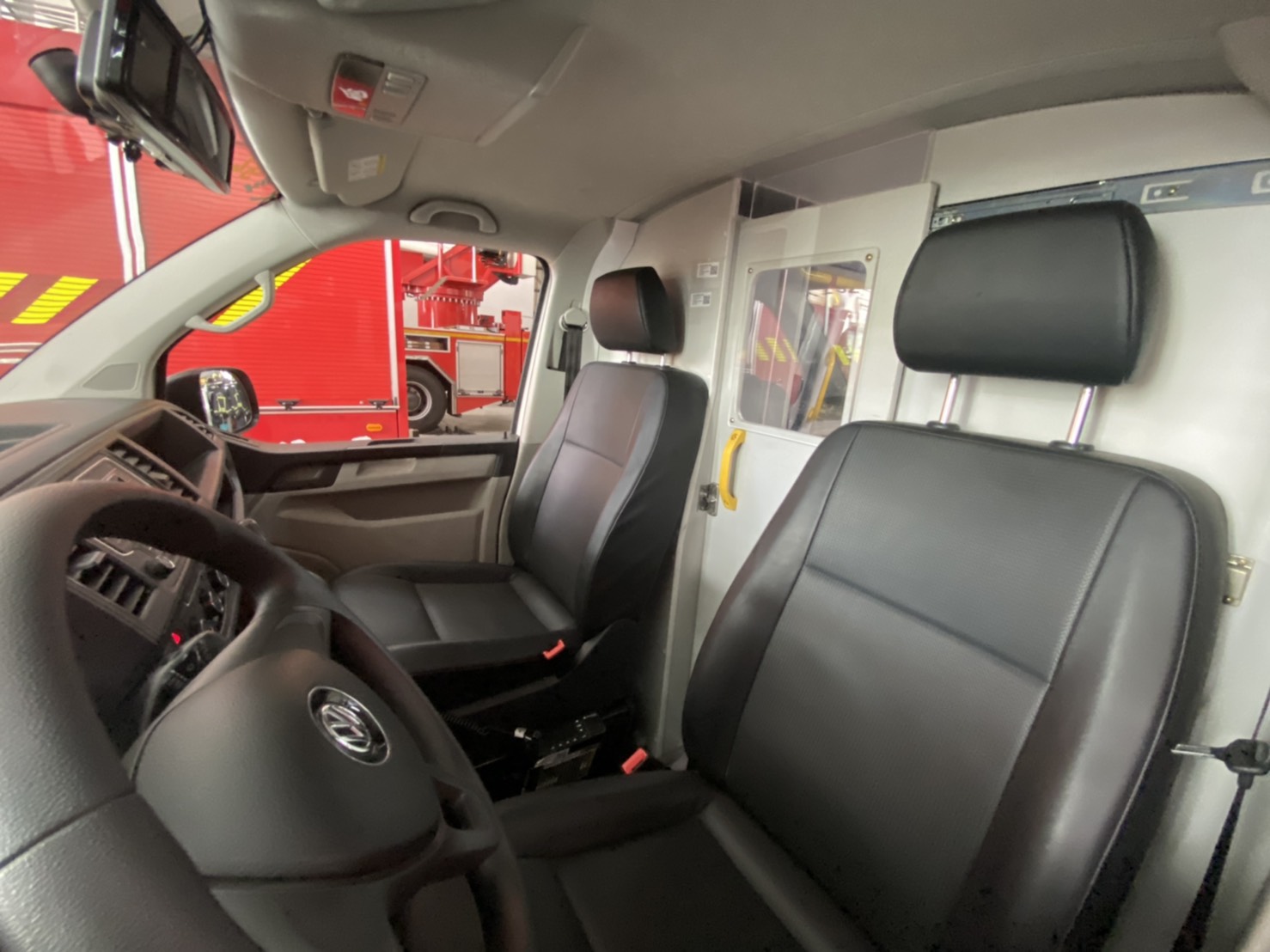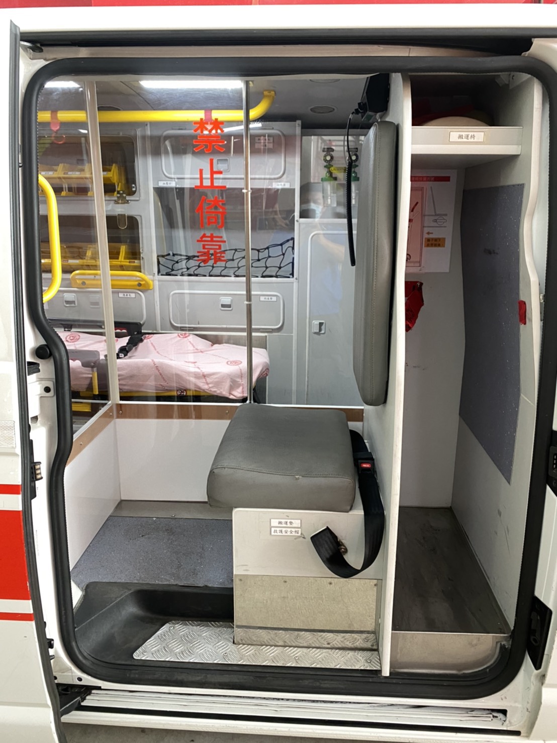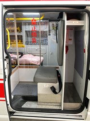 強化防疫救護同仁執勤安全,台中市政府消防局發揮巧思,全國首創防疫救護車「分艙分流」,改裝防疫救護專車,於後艙座位及擔架床間,以透明壓克力板分隔,讓病患於獨立空間內,強化車內安全隔離,節省勤務結束後車內裝備器材消毒時間,提升工作效率,為市民防疫安全把關。