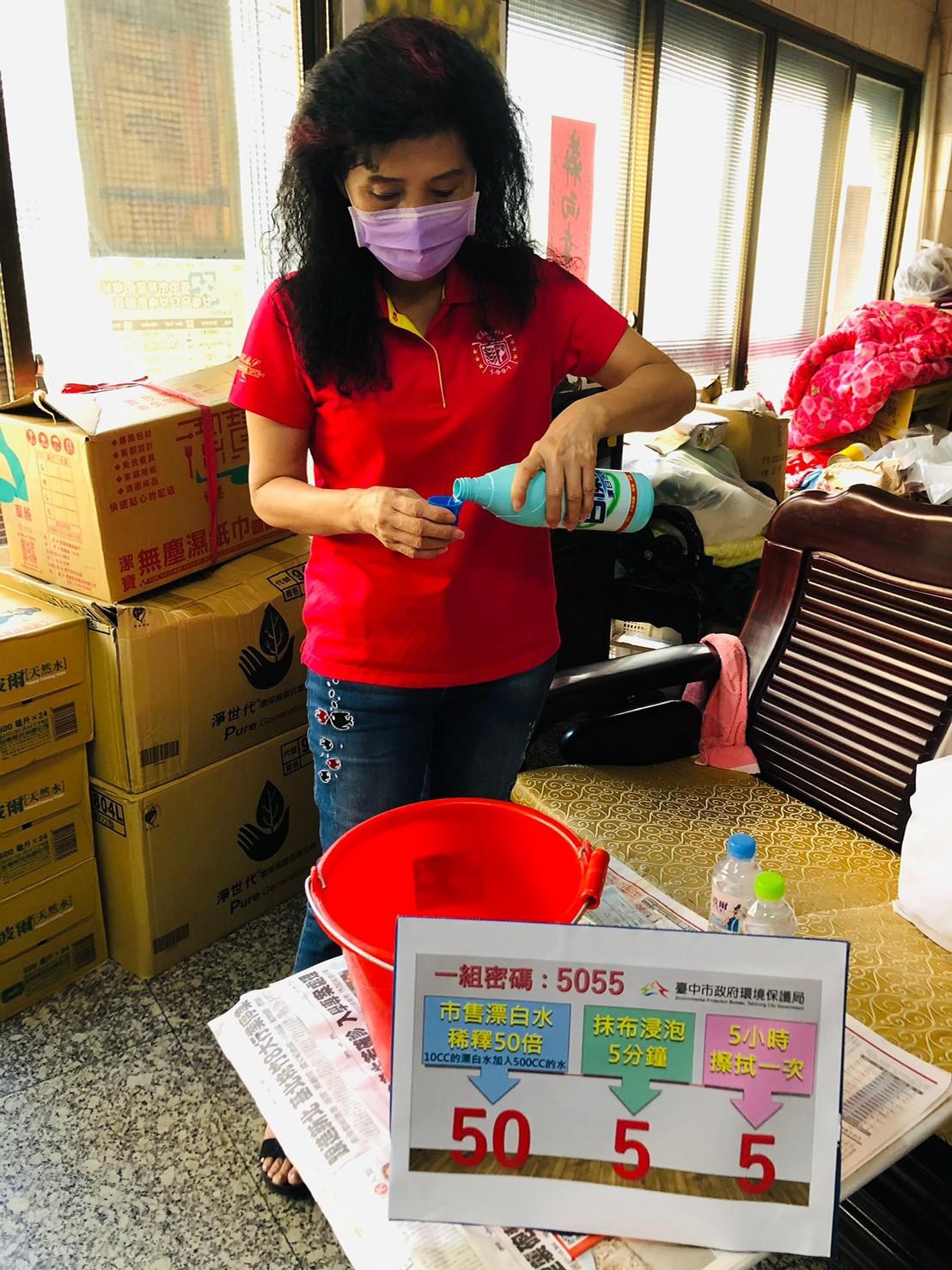 新冠肺炎疫情嚴峻,全國三級警戒延至614日,有鑑於本土確診者及相關足跡已遍及各大縣市,台中市環保志工主動配合全市28區大消毒,除了指導民眾製作簡易自製消毒水,並大呼消毒宣導口號「密碼5055」,盼民眾總動員,為居家環境消毒把關。