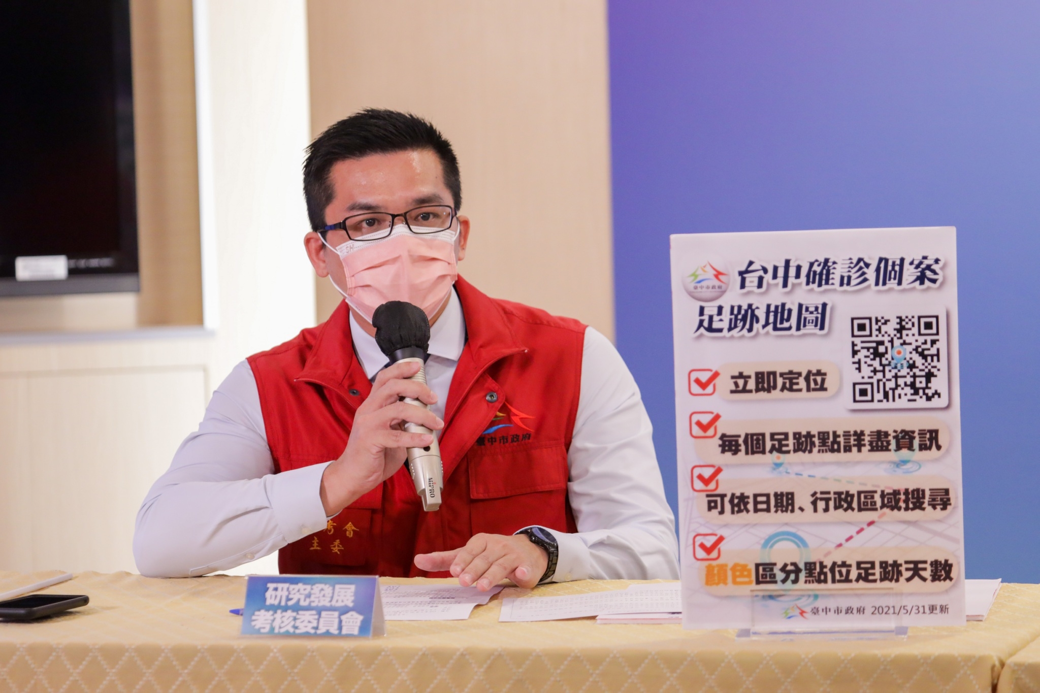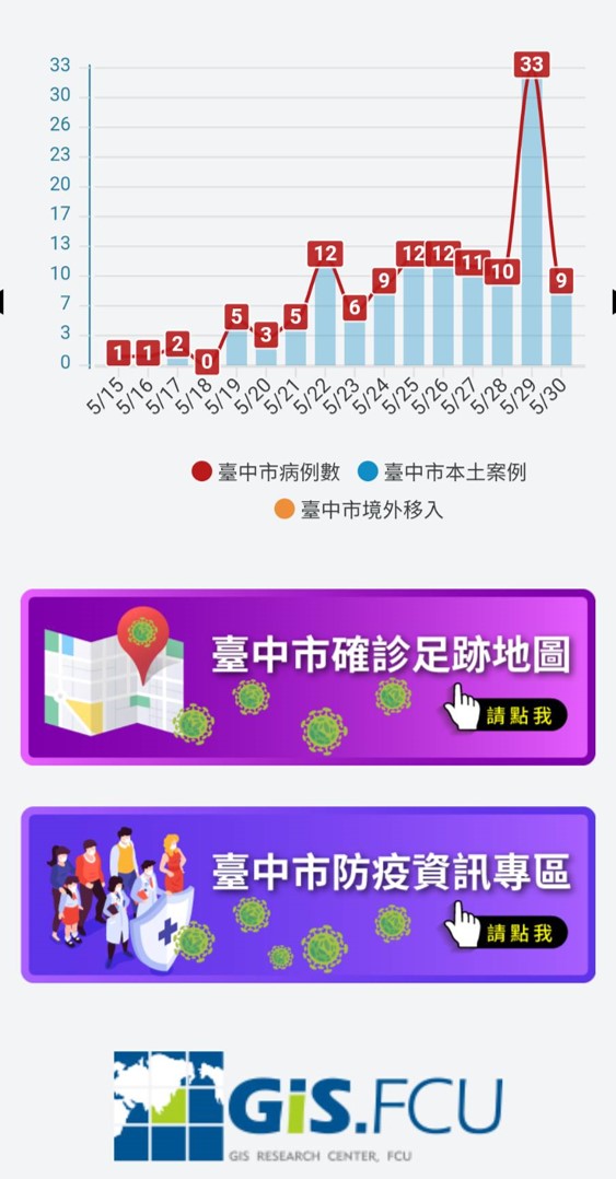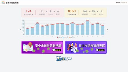 研考會主任委員吳皇昇表示,面對嚴峻疫情,市府除了在官網建置「台中防疫資訊專區」提供各項防疫資訊與措施,近日更與逢甲大學地理資訊中心合作建置「台中確診足跡地圖」,將每日公告的足跡圖卡資訊以地圖呈現,將資訊整合到同一個平台介面,讓民眾可以更方便的查閱是否有足跡重疊,進一步共同防疫。