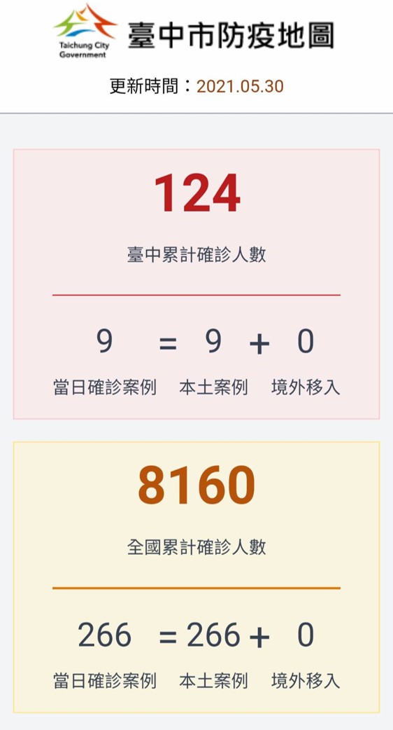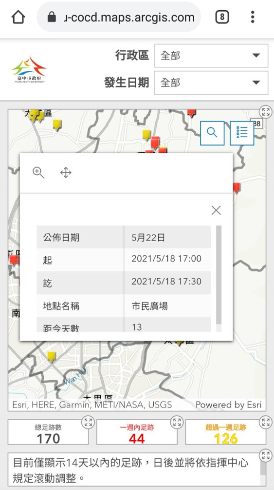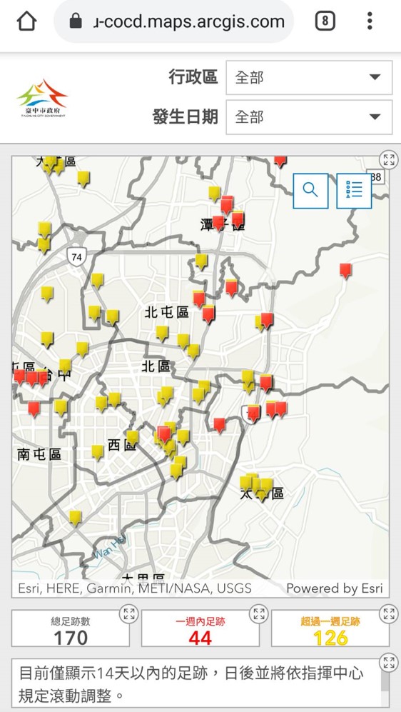 資訊中心表示,為了讓資料呈現更貼近防疫需求,目前為標示14天內確診足跡點位,並用不同顏色區分一周內及一周以上的點位,未來並視視指揮中心規定滾動調整。台中確診足跡地圖: https://track.taichung.gov.tw