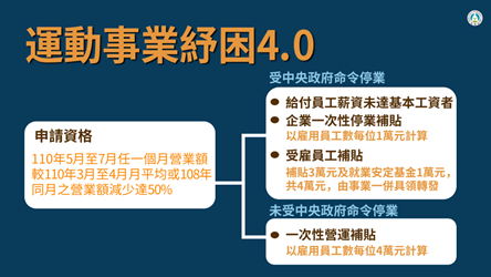 國內疫情爆發衝擊經濟,為加速紓困,教育部針對受影響而有營運困難的運動事業及相關從業人員,推出「運動紓困4.0」措施,補貼包括室(外)運動場館經營管理行業如球類運動場館、室內(外)游泳池、拳擊館、田徑場、健身中心及賽車場等運動事業,及符合資格的運動從業人員每人最高補助4萬元,自6月7日起至8月31日止線上受理申請。