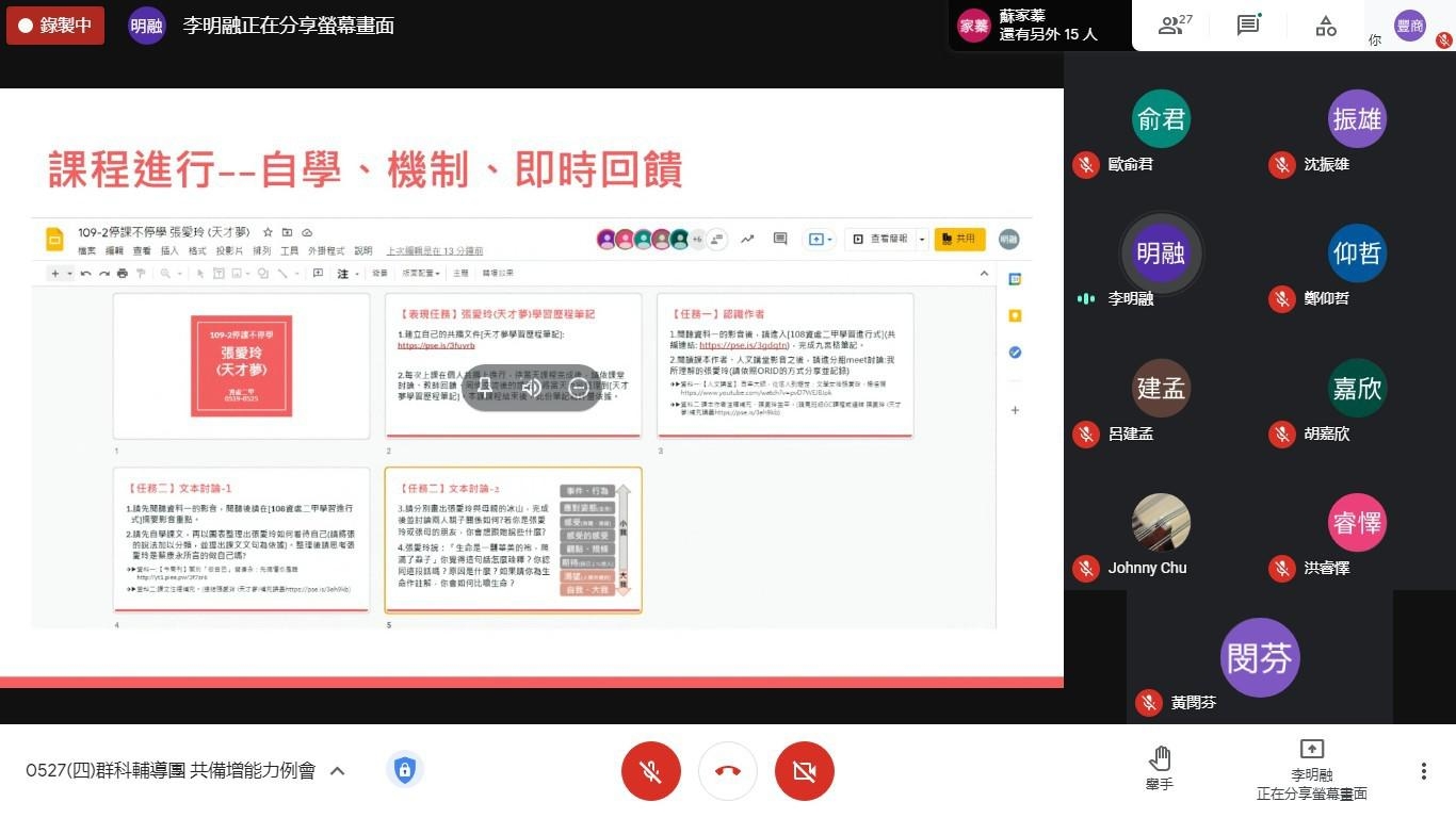 此外,李明融老師會在課前要求學生建立良好的上課秩序與態度,讓學生具有「儀式感」,並運用Google行事曆開設多個會議室,讓學生進行小組討論,提升「參與感」。學生報告後,其他同學須透過螢幕高舉自製牌卡給予回饋,讓班級即使面對電腦學習,也能感受人與人互動的溫度。