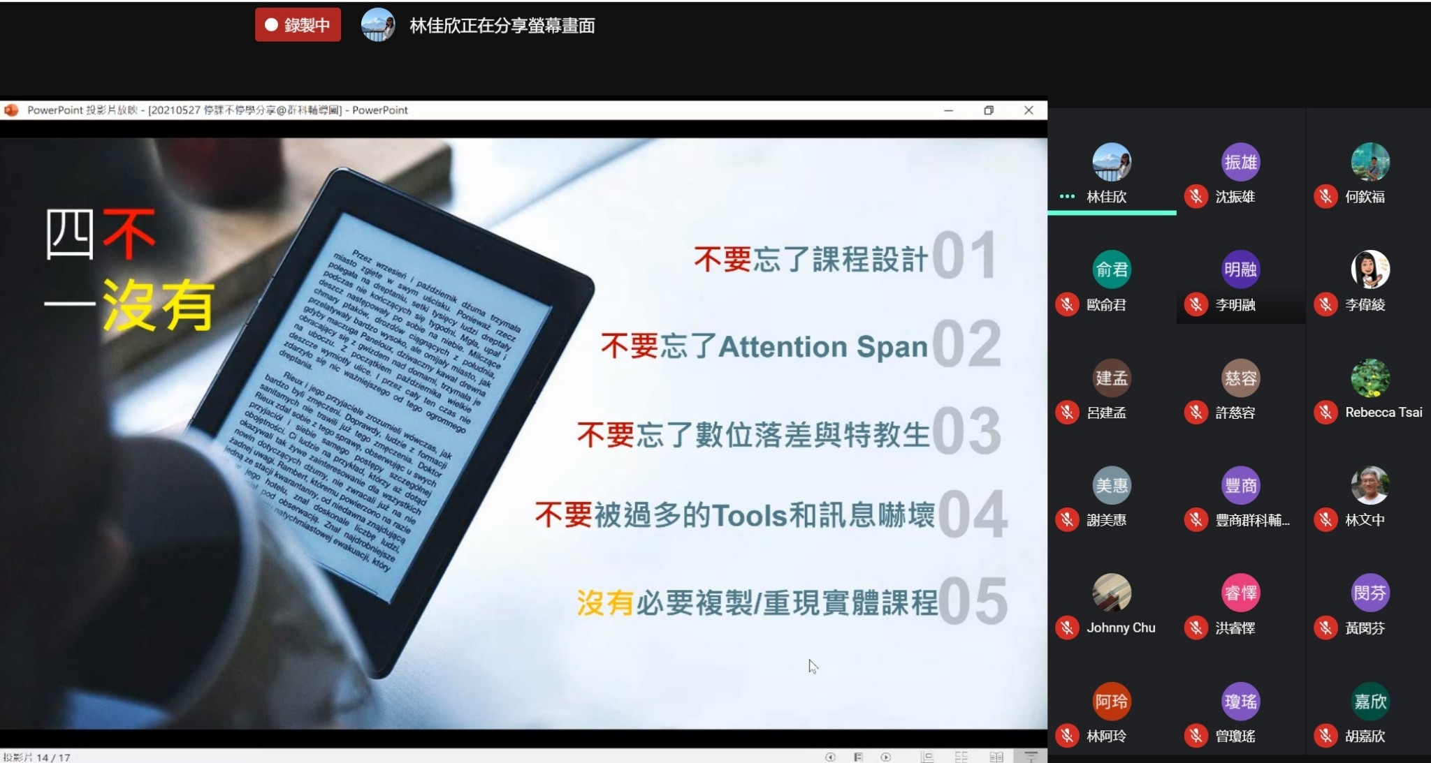 沙鹿高工國文科李明融老師認為,線上教學可思考增加實體課程未能做到的學習目標如「文書編輯」與「自主學習」能力;進行線上學習應考量學生的注意力,採用「少量多餐」方式進行,以8至15分鐘為一次循環,轉換教學重點,透過拆解知識點和教學步驟達到最佳成效。