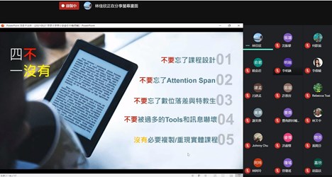 台中市課程發展中心技術型高中群科輔導團因應疫情升溫,全台學生停止到校、居家線上學習,日前舉辦線上團例會,邀請3位輔導員分享近日進行線上教學的經驗,除提供方便教學使用的軟體外,也釐清許多教師面對線上教學的迷思,提醒轉換思維並善用線上軟體輔助,教學模式轉變反而是師生成長的契機,給予學生更多自學空間。
