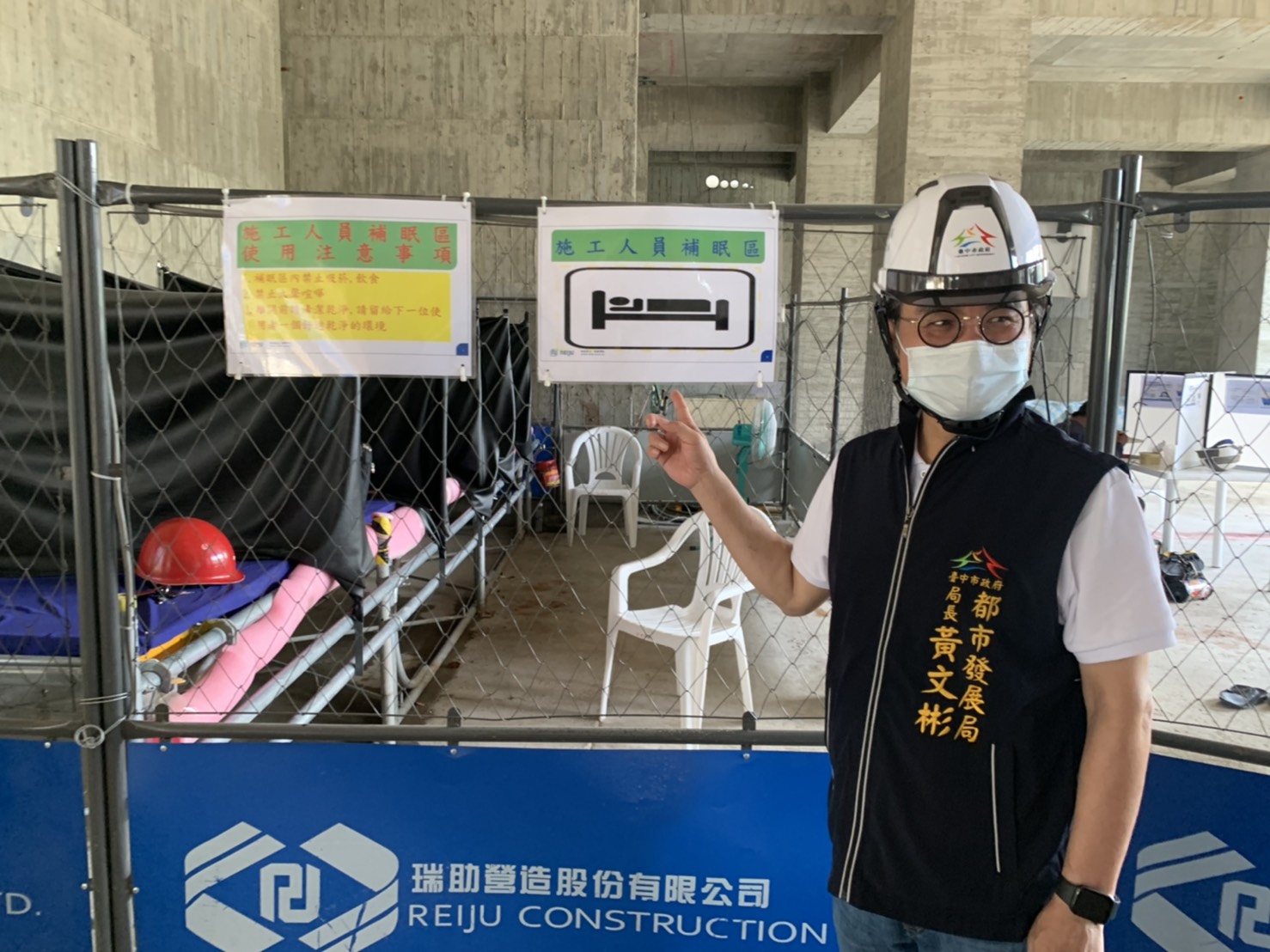 黃局長與住宅處處長陳全成一同視查社宅公共工程及勤美之森民間建築工程,現場均提供勞工友善防疫用餐環境。