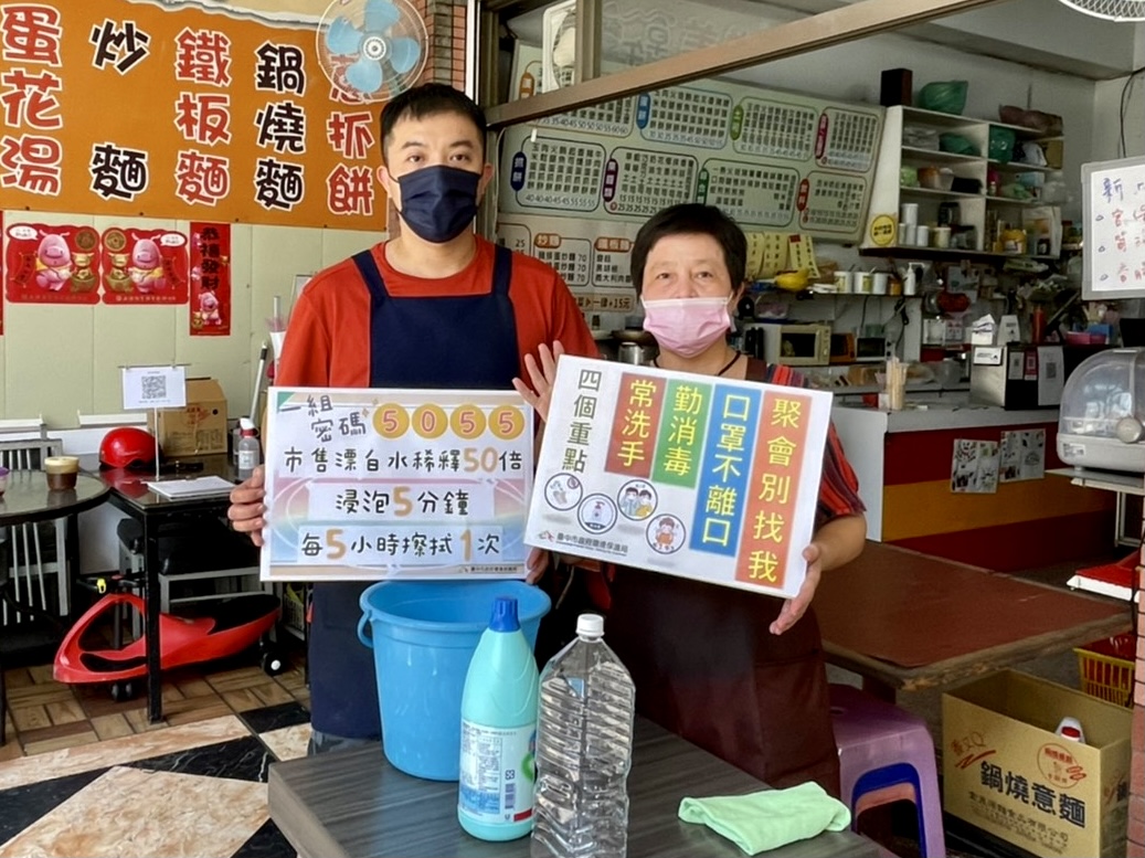 美滋美早午餐店王童秀琴老闆娘則說,現階段配合市府政策暫停提供內用服務,搭配環保局宣導「5055消毒法」,以後每日早上會先調配簡易消毒水定時針對店內工作平台、地板及待餐區桌椅進行擦拭消毒工作,提供顧客乾淨安全的取餐環境,確保食安及環境衛生品質。
