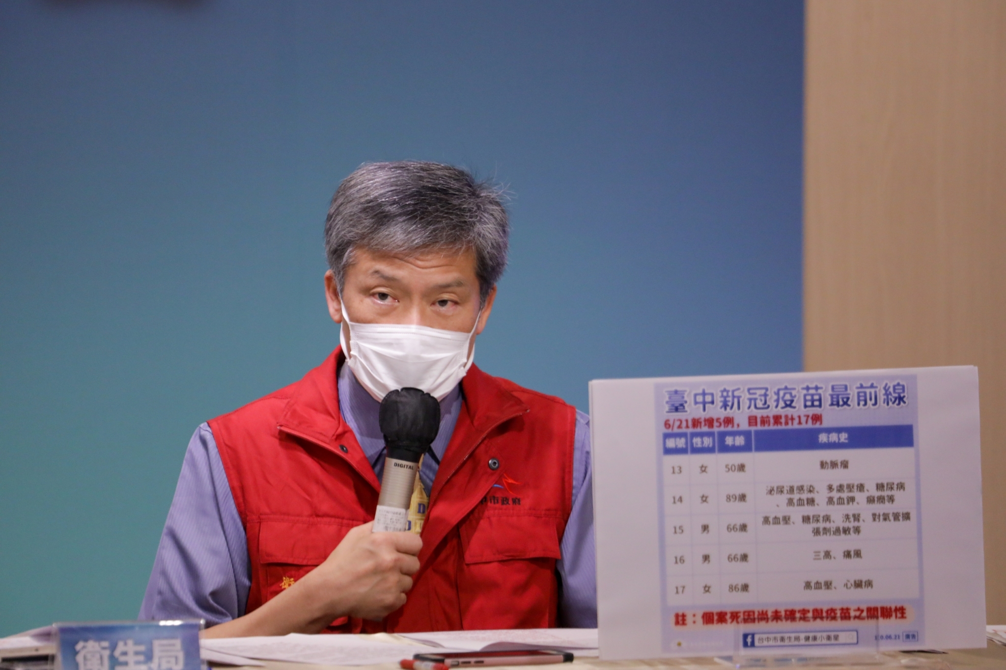 台中今日新增5例疑似施打疫苗後死亡案例,衛生局長曾梓展說明,第一例為北屯區一名50歲女性,6月16日下午接種AZ疫苗,當晚回家洗澡暈厥後送中山附醫急診,緊急處理後送開刀房,17日收治外科加護病房,18日血壓不穩並於當日下午死亡;第二例為南屯區一名89歲女性,有泌尿道感染、多處壓瘡、糖尿病、高血糖、高血鉀、癲癇等病史,6月16日於護理之家接種疫苗,接種當晚有嘔吐及體溫偏高情形,19日上午發現個案已無生命跡象,因已明顯死亡,故未送醫救治。