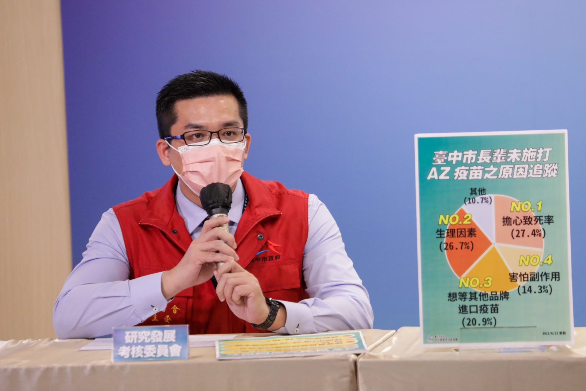 吳主委指出,經初步統計,符合資格卻未施打AZ疫苗的長輩,最主要的前四項原因分別為「擔心疫苗致死率」(27.4%)、「生理因素(近期身體不佳或住院中)」(26.7%)、「想等其他品牌的進口疫苗」(20.9%)及「擔心疫苗副作用」(14.3%);其他如「已自費施打」、「長輩本人不住在台中」、「覺得不需要疫苗」等因素占10.7%。(6/22*7)*研究發展考核委員會