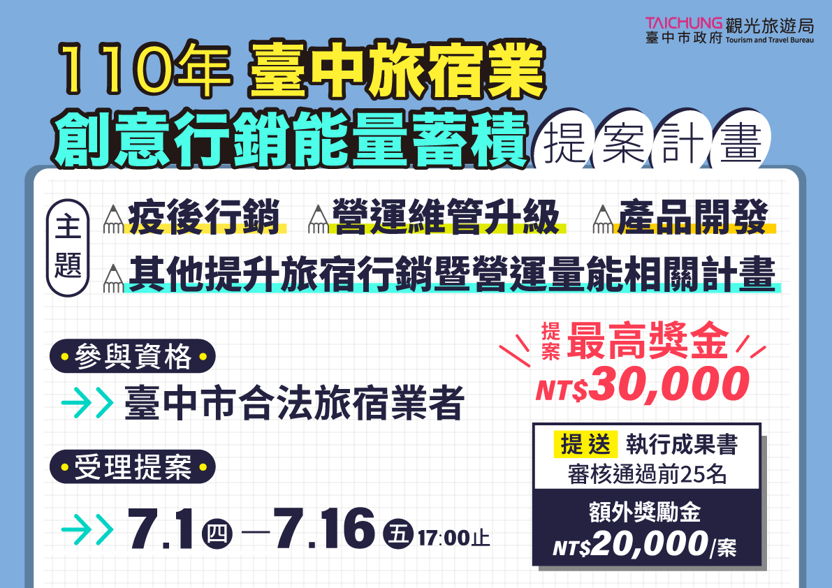 觀旅局表示,推出「台中旅宿業創意行銷能量蓄積計畫」,希望鼓勵業者積極研提疫後振興計劃,盤點及儲備能量,蓄勢待發;凡是台中市合法設立旅宿業者均歡迎提案參與,提案可採紙本投遞或電子郵件寄送辦理,受理期間自7月1日至16日止,提案計畫主題可包含疫後行銷、營運維管升級、產品開發、其他可提升旅宿行銷暨營運量能相關計畫等,並依評審結果核定獎金,每項提案最高金額為新台幣3萬元,評審結果預計7月底公布。