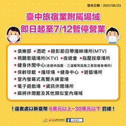觀旅局補充,為避免造成防疫破口,台中旅宿業附屬場域也持續暫停營業至712日,包括俱樂部、酒吧、錄影節目帶播映場所(MTV)、視聽歌唱場所(KTV)、夜總會、指壓按摩場所、健身休閒中心(含提供指壓、三溫暖等設施之美容瘦身場所)、保齡球館、撞球場、健身中心、室內螢幕式高爾夫練習場、遊藝場所、電子遊戲場、資訊休閒場所、麻將休閒館及其他類似室內場域)。請民眾配合暫緩涉足,以確保自身及他人安全,共同為防疫盡一份心力。草悟廣場富地市集暫停營業至110630日,後續將進行內部整理。