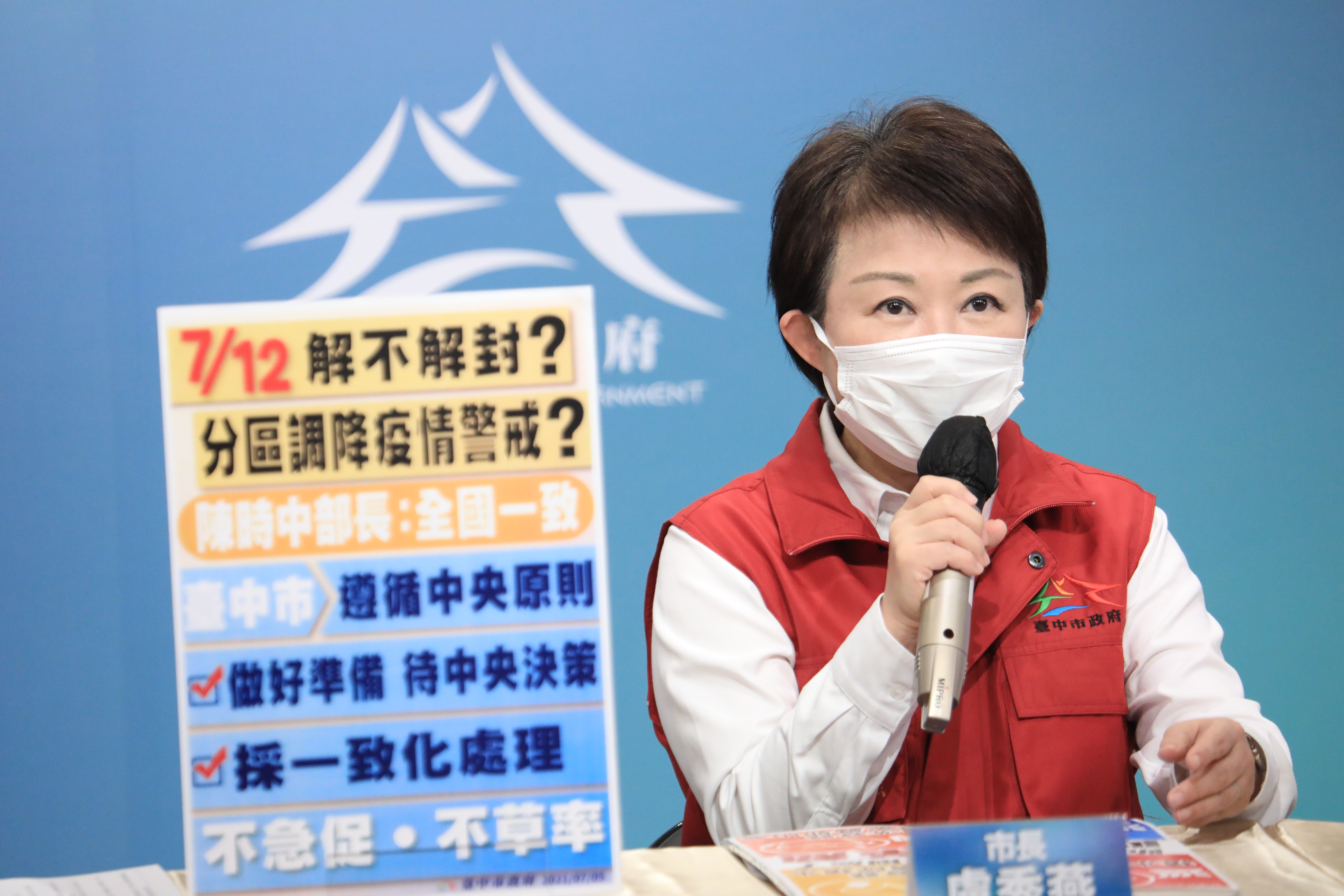 盧市長今日下午舉行台中市疫情指揮中心線上記者會時說明,距離7月12日只剩一週,中央昨日防疫記者會已提出市場及夜市重點管制措施,她相信中央近期就會對於三級警戒狀態進行相關宣布,這也會是市府後續防疫政策的重要參考;她強調,衛生福利部長陳時中已明確表示「解封方向與措施還是以全國一致為主」,相關政策應一致,微解封不會急促、草率上路。(7/5*18)*經濟發展局