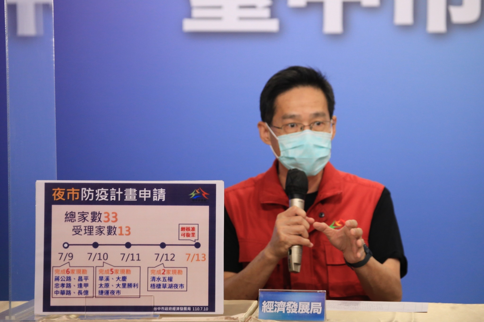 張局長表示,目前共受理13處夜市申請,包含逢甲、中華、忠孝、蔣公路、昌平、長億、旱溪、大慶、太原、清水五權、捷運、大里勝利及梧棲草湖夜市,第一階段書面審查皆符合規定,第二階段進行現勘,目前已於7月9日下午及10日上午完成11場次現勘,預計12日可完成至少11場次內部審核程序,並發文通知夜市依所提計畫確實執行相關工作。