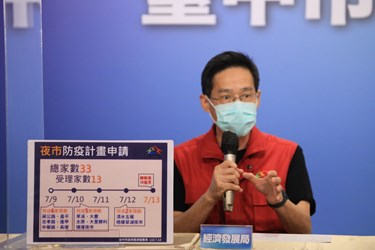 經發局長張峯源說明,台中33處公告停業夜市採「申請程序」、「管制措施」等兩大原則,夜市防疫計畫申請已於7月8日公告在經發局網站(https://bit.ly/3yHxHLp ),由夜市管理委員會或負責人擬具防疫計畫書,夜市提出的防疫計畫書內容應提出具體因應作為,如減少出入口、專責人力負責實聯制、量測體溫、手部消毒、監控容留人數,及攤商與工作人員造冊、健康狀況監測、訂定環境清消計畫、如發生確診病例時的應變措施等。