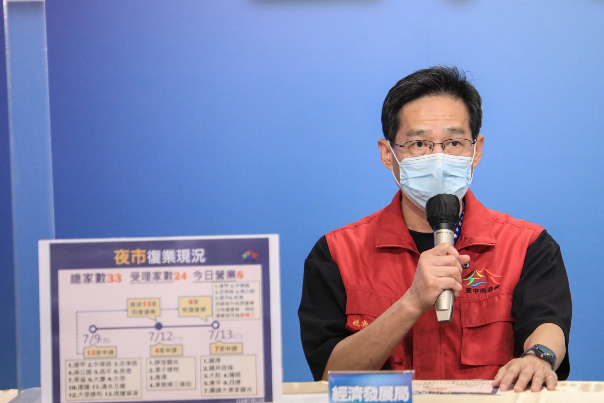 經發局指出,昨日收件的4家夜市,包括潭子勝利、靜宜觀光、雅潭、東勢第三橫街夜市,及今日收件的7家夜市,包括龍津、龍井自強、大肚、陽明、東平、四德、霧峰大東家觀光,市府夜市申請案件受理後,原則會在7日內完成審查,如業者書面資料完整,經發局將儘速排定會勘,協助業者在預計的營業日前完成防疫計畫核定。(7/13*6)*衛生局