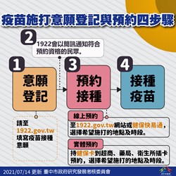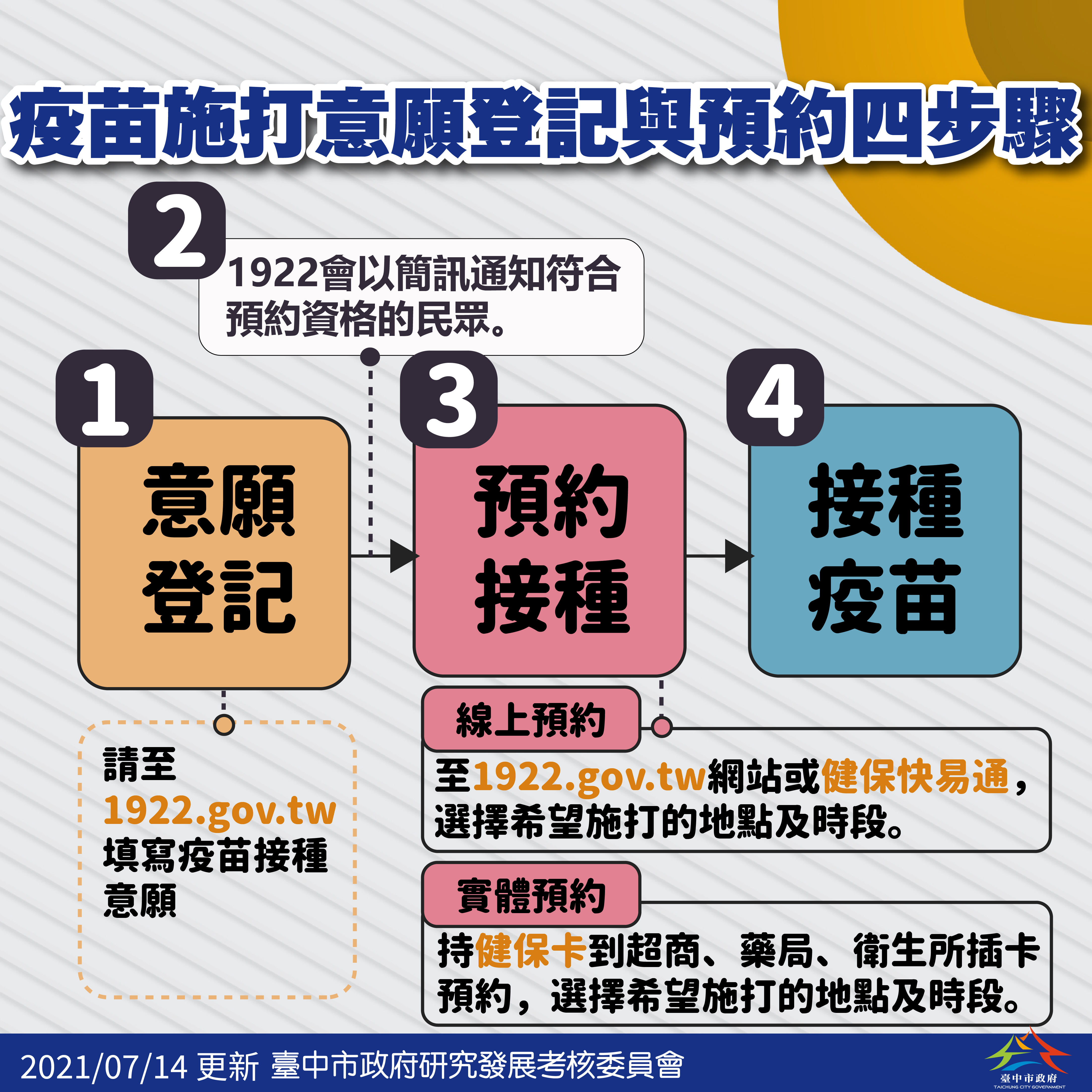 研考會主委吳皇昇表示,中市府兩大服務中心於疫情期間仍秉持著服務不間斷,並率先成立「COVID-19疫苗意願及預約接種登記服務櫃檯」,民眾填寫疫苗意願登記後,櫃台會提供貼心服務單,讓符合預約資個的民眾收到簡訊時,可以進行後續疫苗預約動作,以備完善的資訊讓民眾免去煩惱。符合條件且有意願之民眾,歡迎儘速上線登記,有效率地提升疫苗施打覆蓋率,為全民防疫共同努力。(7/14*7)*研考會